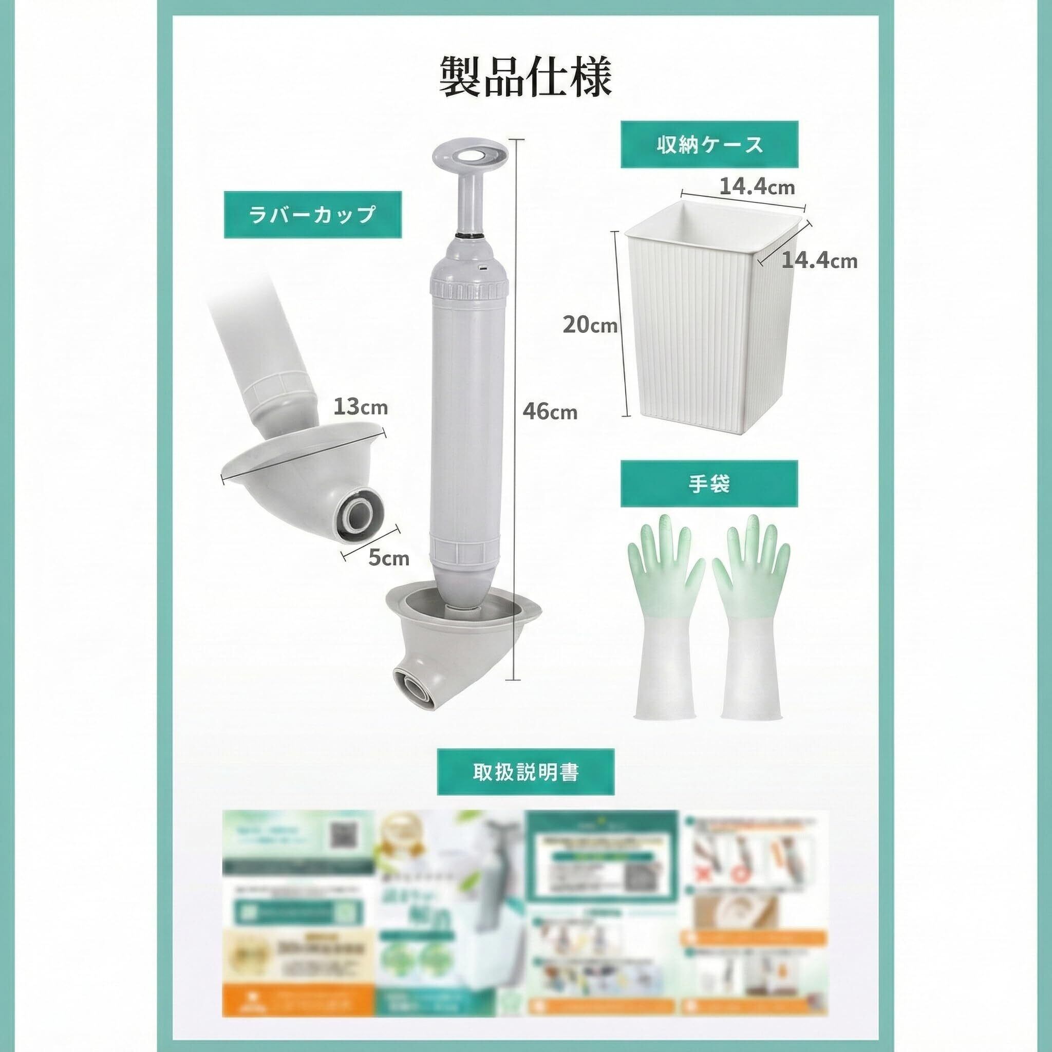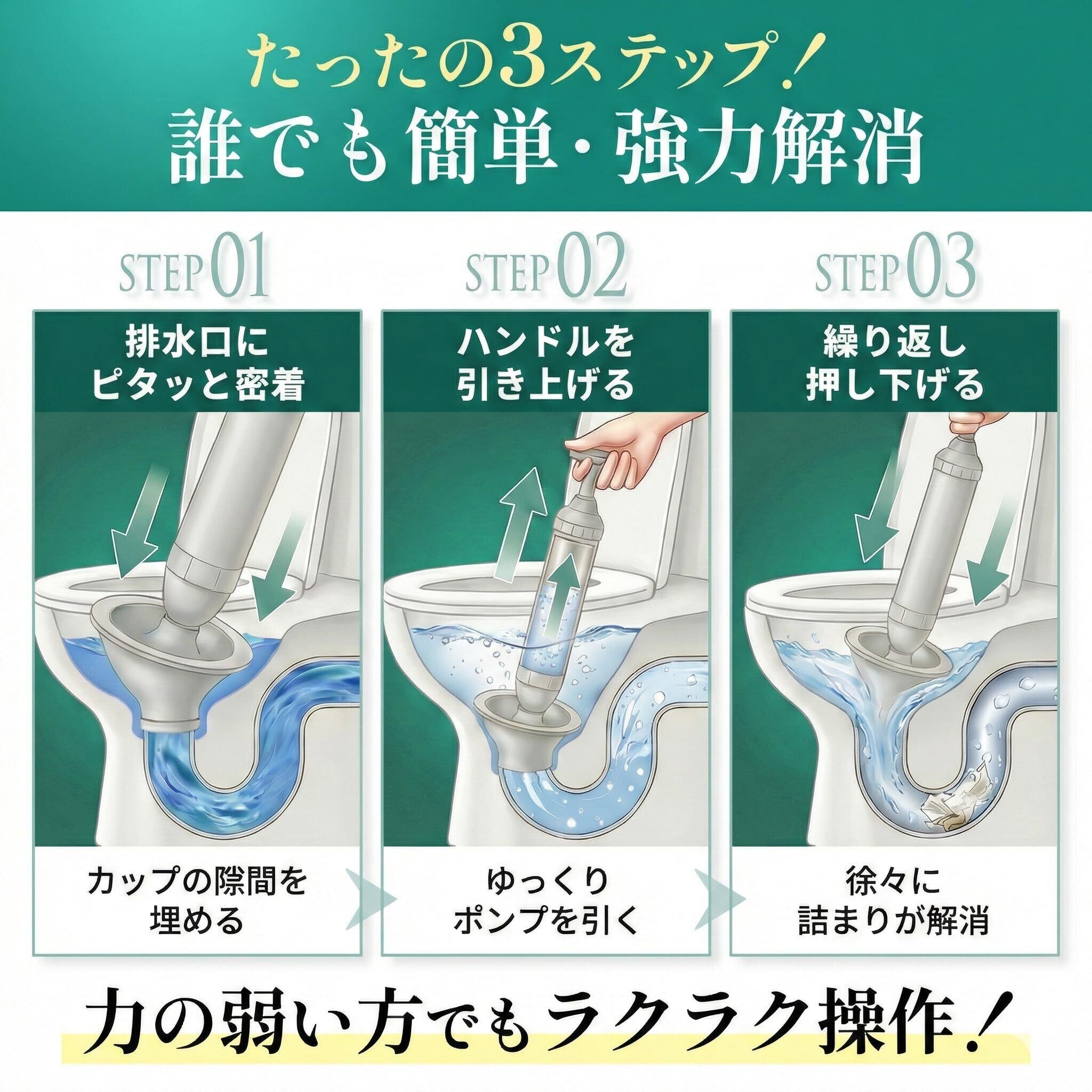 【女性でも簡単に使える】フルカラー説明書付属、チカラを入れずに簡単な操作で詰まりを取り除けます