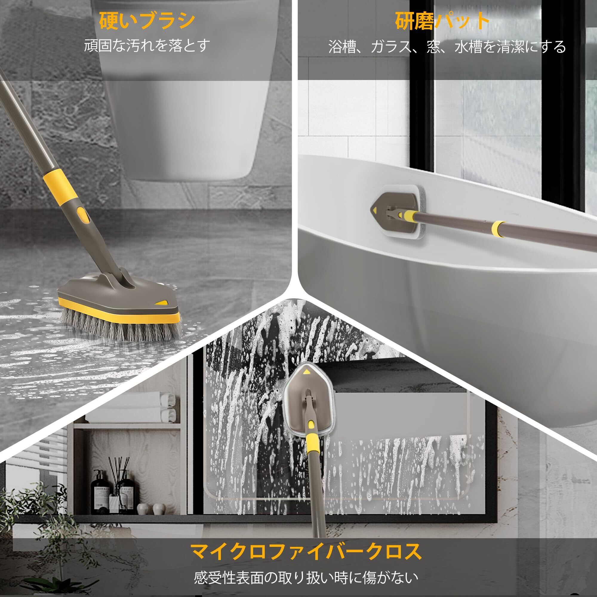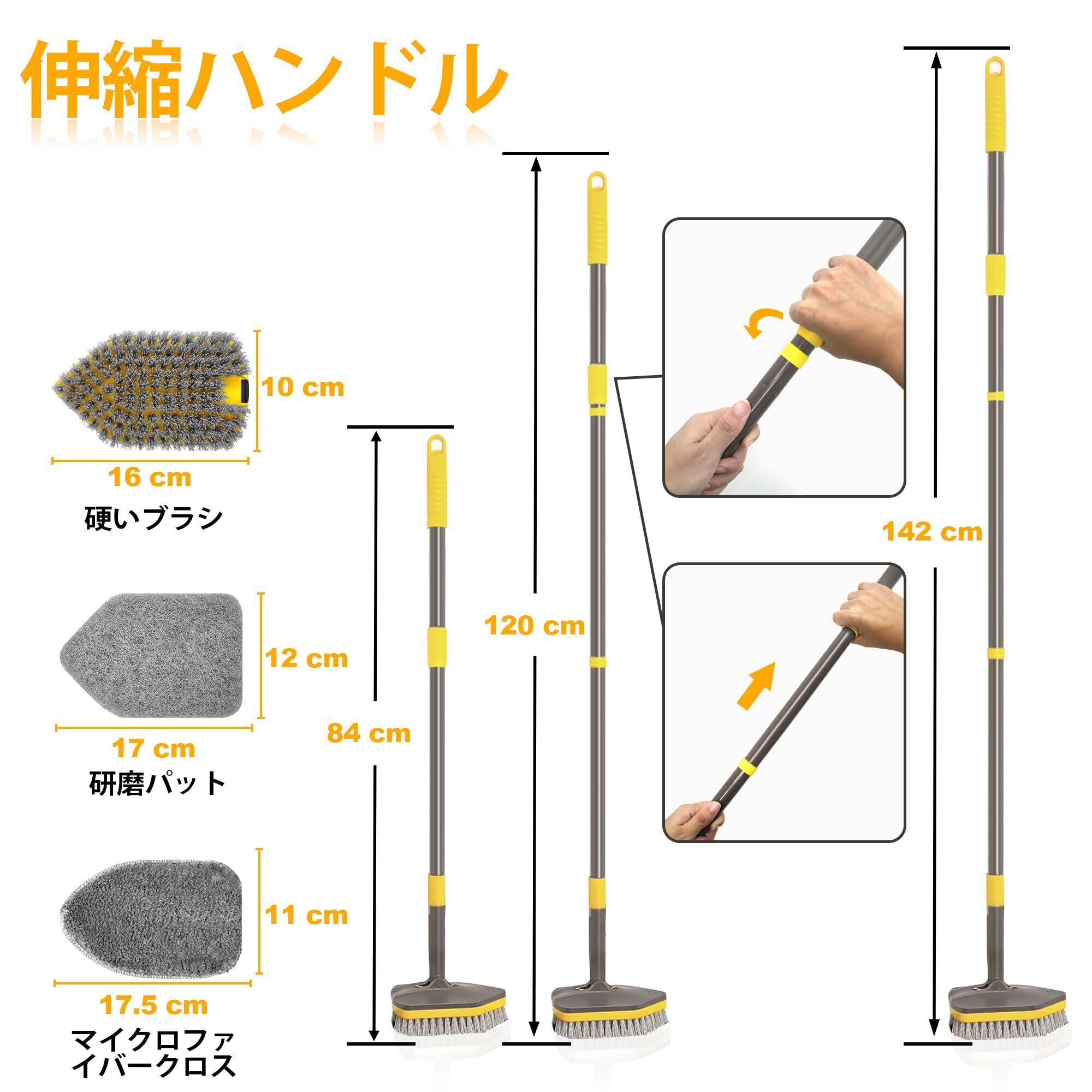 NEWE お風呂掃除 ブラシ,デッキブラシ 伸縮式ロングハンドル付 142cm,浴室床ブラシ クリーニング用交換ヘッド4個付きお風呂掃除用 浴槽 床 幅木 シンク キッチン トイレ(黄色い)