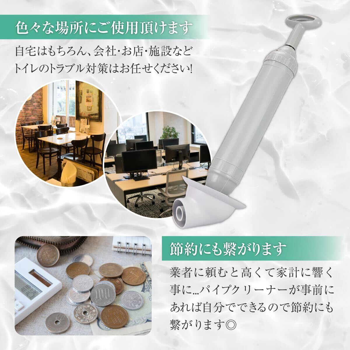 【注意事項】●長く深く引っ張り過ぎるとハンドルが抜けたり、空気穴から逆噴射する可能性があるので短く浅く押し引きして下さい。※ハンドルが抜けるとケガの恐れがあります。●全ての詰まりを解消する保証をするものではありません。●柄の部分から内面の潤滑油が構造上少し漏れている場合が御座いますが、ご使用上は問題御座いませんので拭き取ってからご使用下さい。●極稀に商品本体に茶色い汚れの様なものがある場合が御座いますが、製造上の過程に加工する際の熱によって付いてしまうものなので問題御座いません。