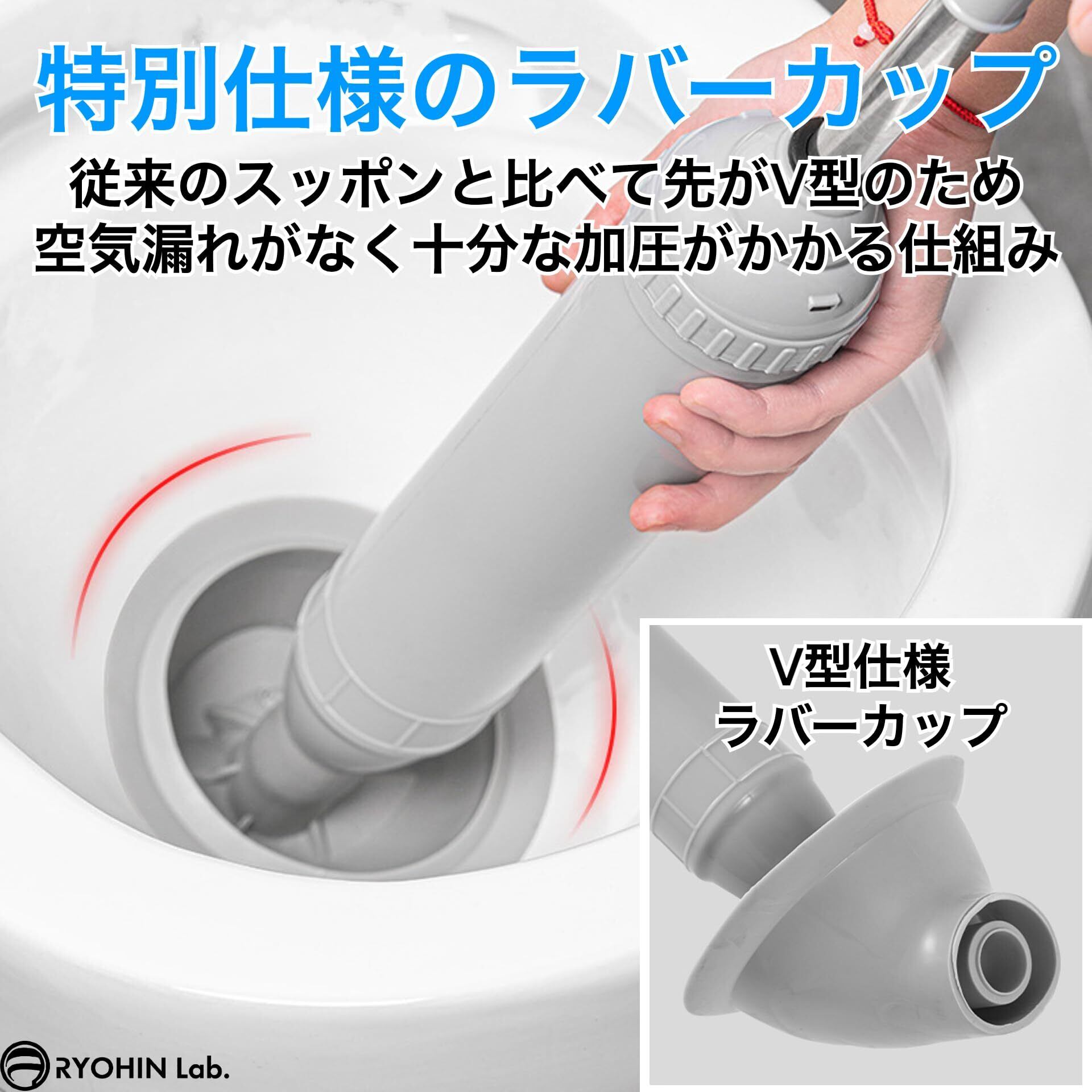 【特別仕様のラバーカップ】従来のスッポンと比べ、空気漏れがなく十分な加圧がかかる仕組み。どんなトイレのサイズにも合うように先が V 型になっているので、トイレの詰まり解消効果が高くなっています。