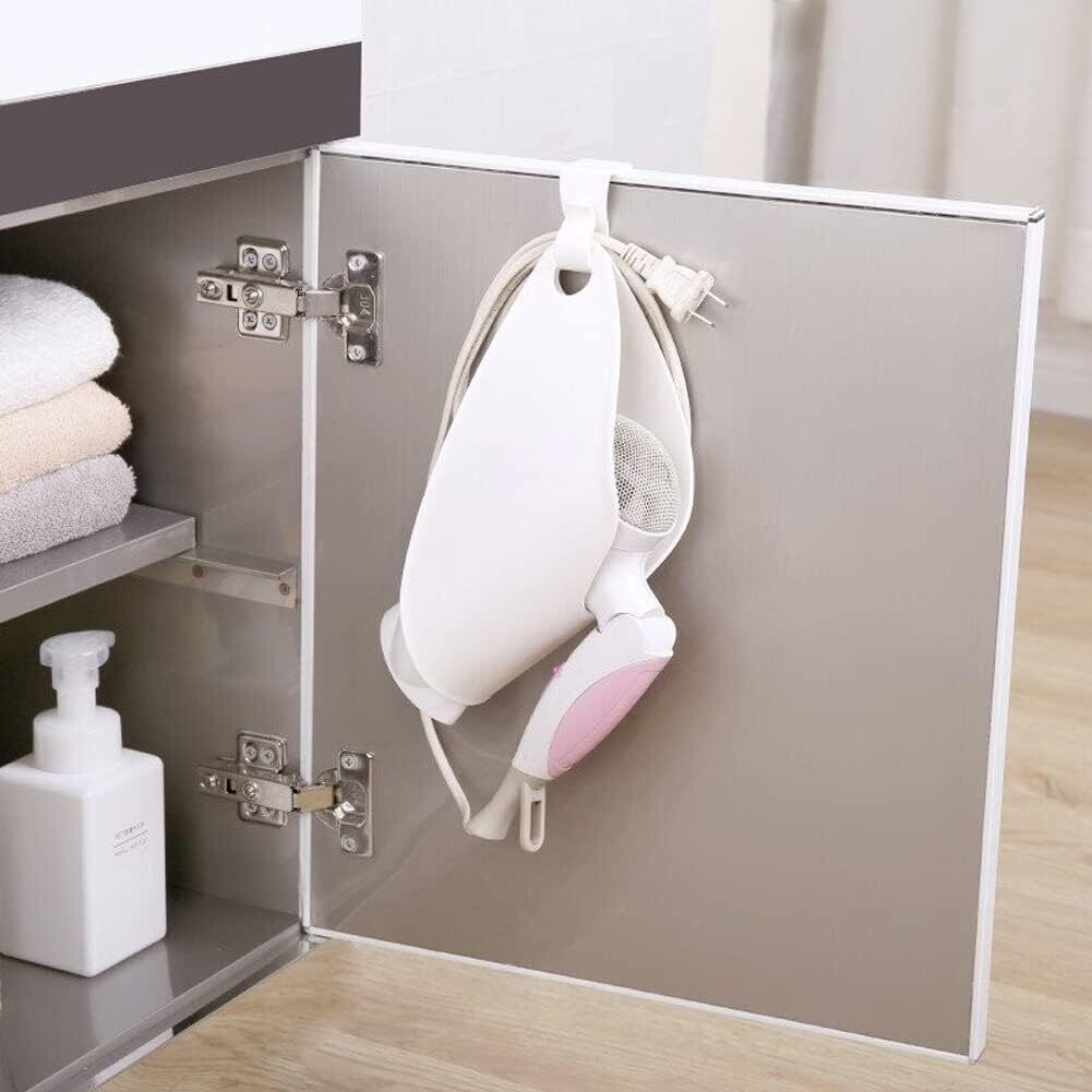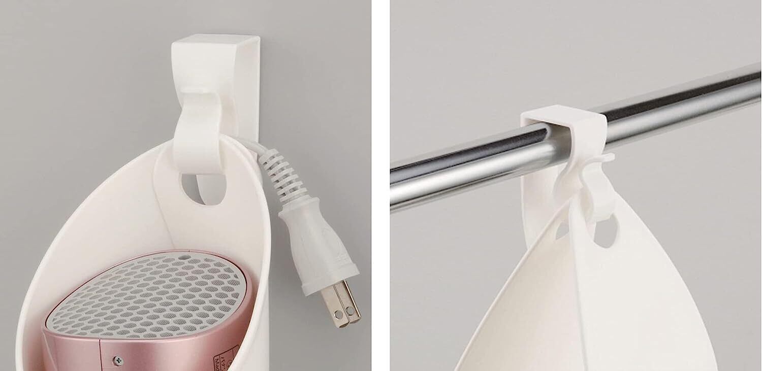 洗面まわりのちょっとしたスペースにドライヤーを掛けて収納できるので便利です。コードを掛けることもできるのでスッキリ収納できます。 耐荷重:約800g 取り付け可能なポール:約26mm以下 取り付け可能な扉:扉の厚さが約13〜24mmで扉上のすき間が約4mm以上のもの。 この商品はしろい手が販売します。しろい手サンクスカード付(※しろい手サンクスカードの付属がない場合は当店またはにご連絡ください。)