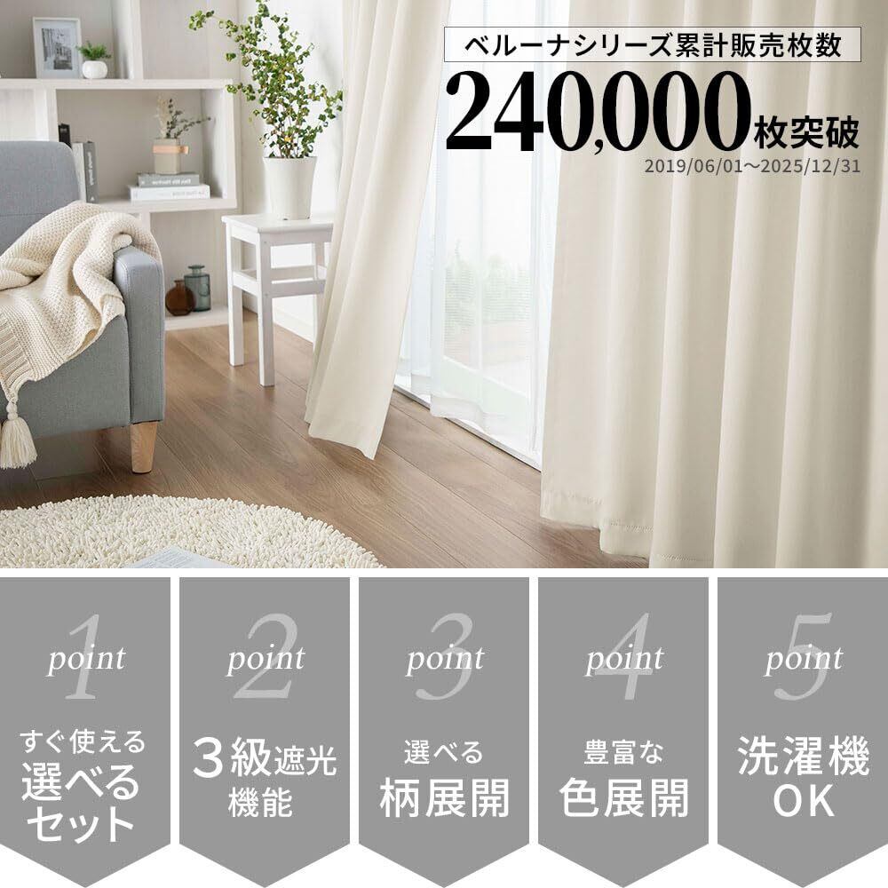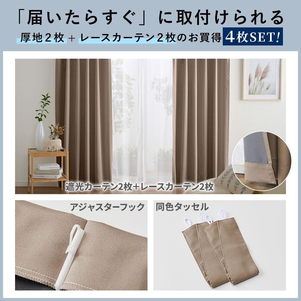 【数量限定】ベルーナ(BELLUNA) カーテン 4枚セット 遮光 幅100 無地 タッセル付 アジャスターフック付 (カーテン2枚 レース2枚 555814-902)