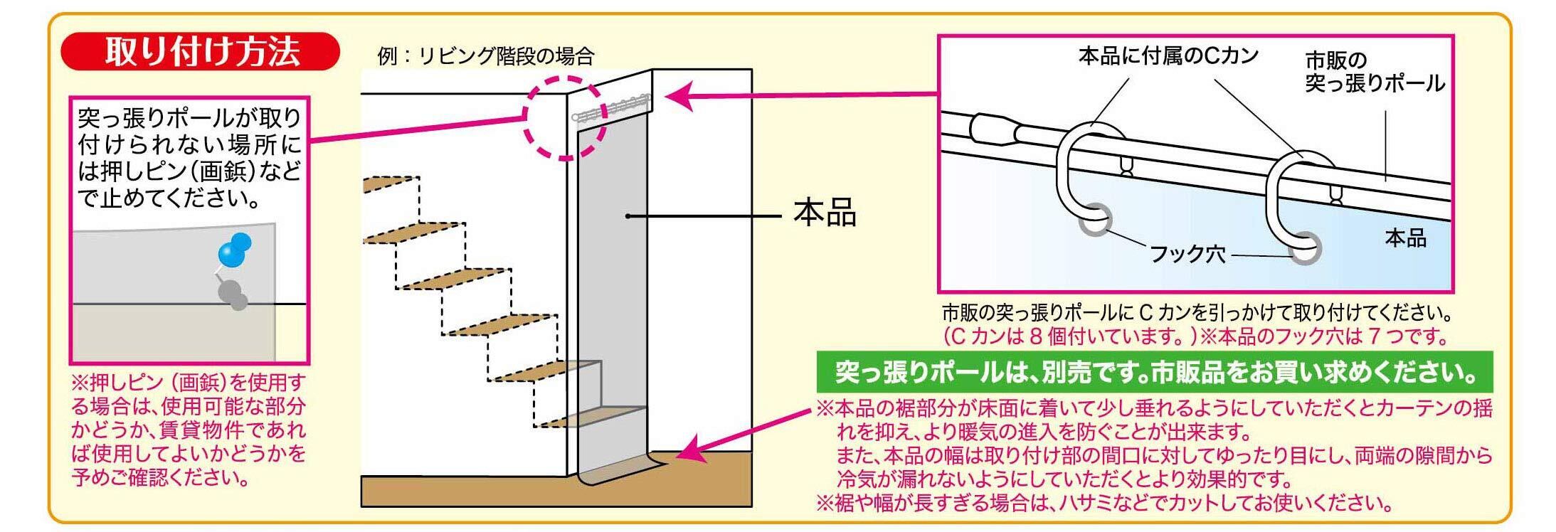 リビング階段の登り口などに設置し、エアコンの冷気を逃さない間仕切りカーテン。 床まで届くロング丈で涼しい空気をしっかりキープ。 突っ張りポールに引っ掛けるだけの簡単設置。 取り付け用Cカン付き(突っ張りポールは付属していません)。