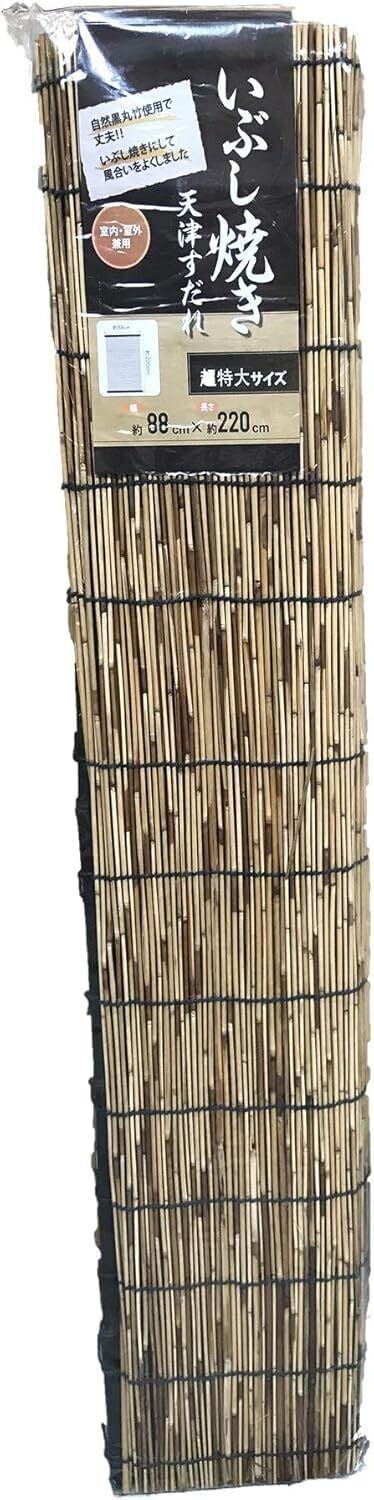 一般のすだれは上下の桟に平竹が使用されておりますが、いぶし焼すだれは反りを抑えるため天然素材の黒丸竹を使用しております。この黒丸竹を天地に使用することにより丈夫で、しかもインテリア性に優れた商品に仕上げました、さらに紫外線をカットし断熱効果でお部屋の冷房効果もアップします