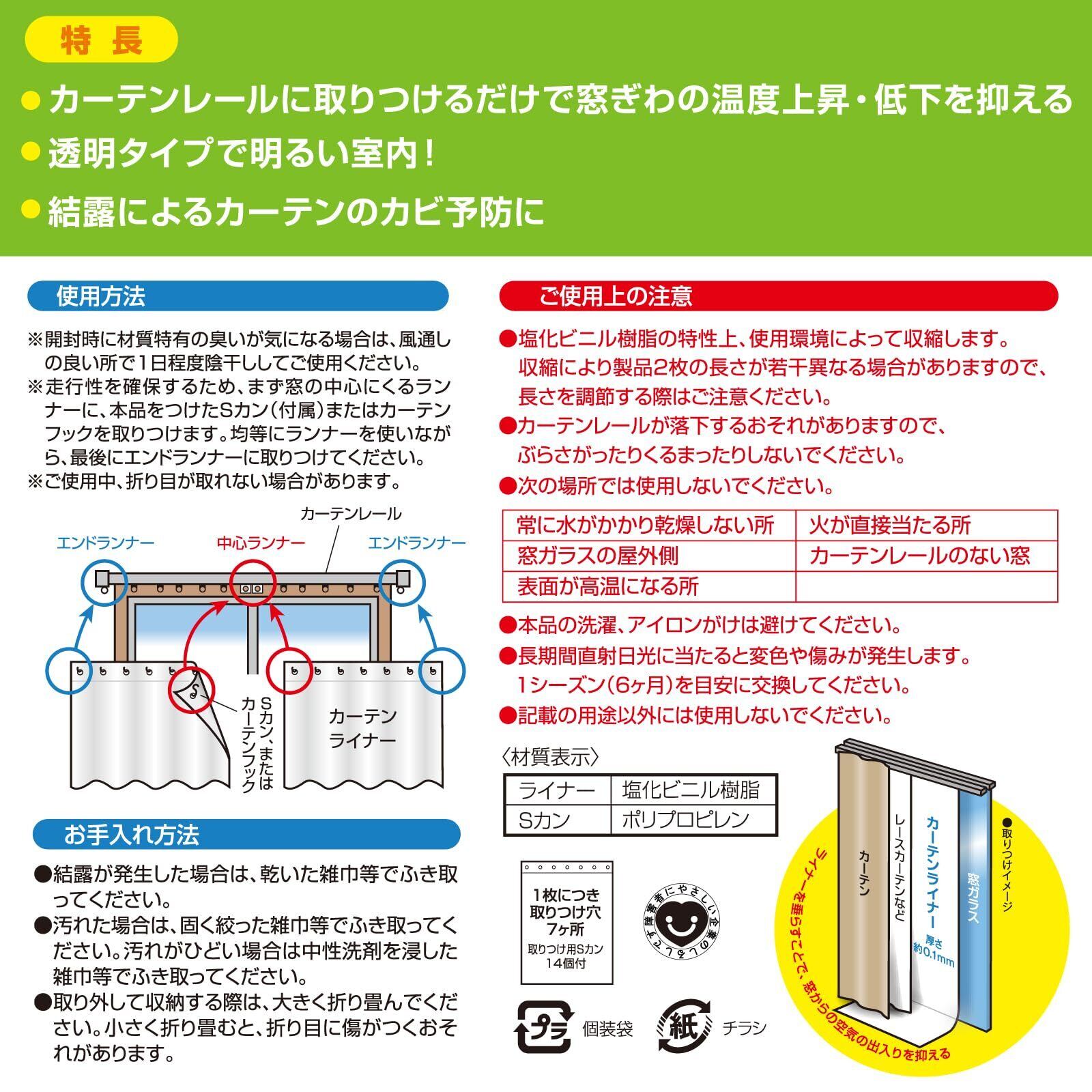 ニトムズ 省エネ カーテンライナー 夏涼しく 冬あったかい カーテンレールに取り付けるだけ 電気代節約 窓 オールシーズン 夏冬兼用 断熱 透明 L 幅100cmx高さ225cm 2枚入 HH0011
