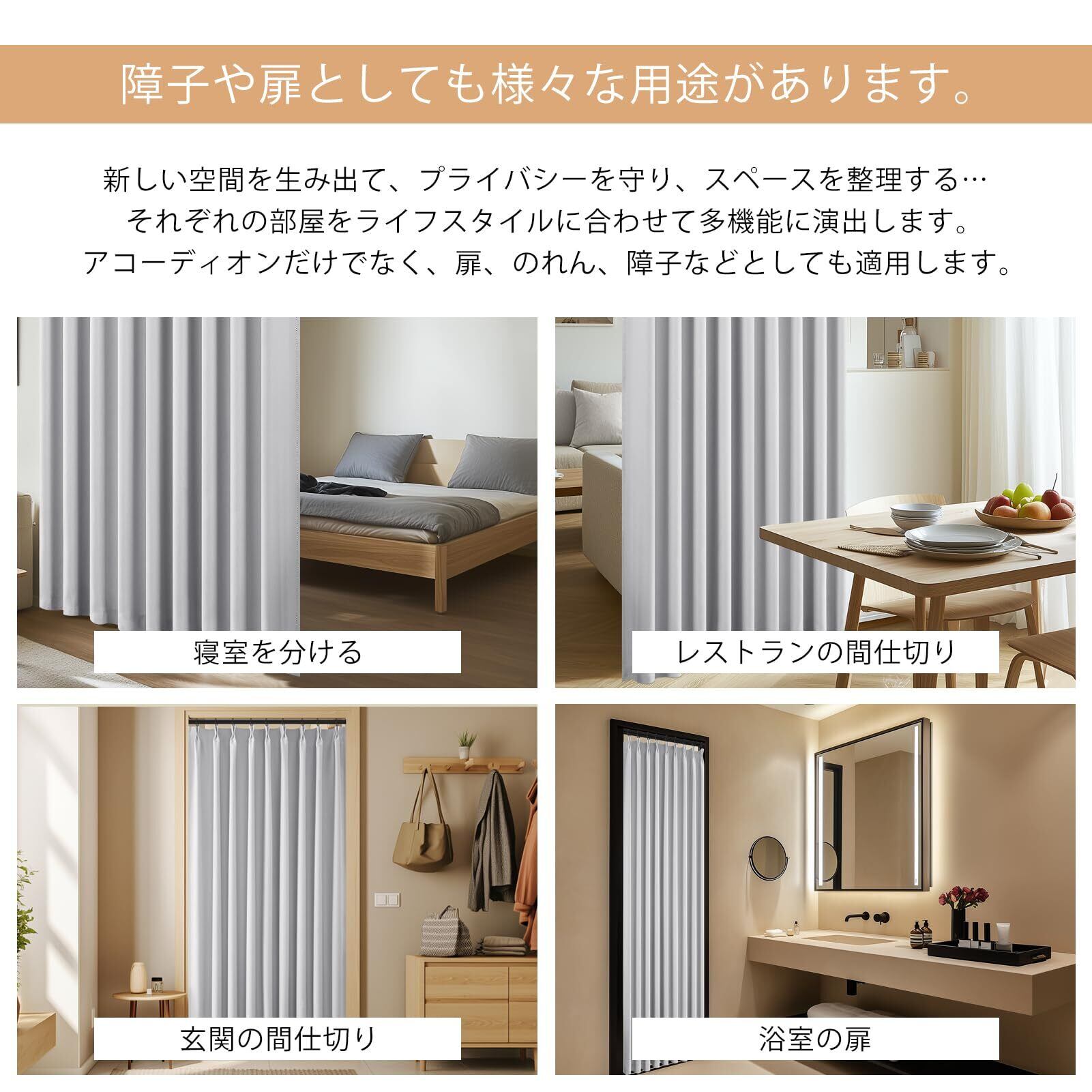【適用】:部屋、階段、玄関、リビング、ドア、キッチン、脱衣所などいろいろな場所で使える。新しい空間を生み出すことができる。さらに、きちんとプライバシーを守れる。