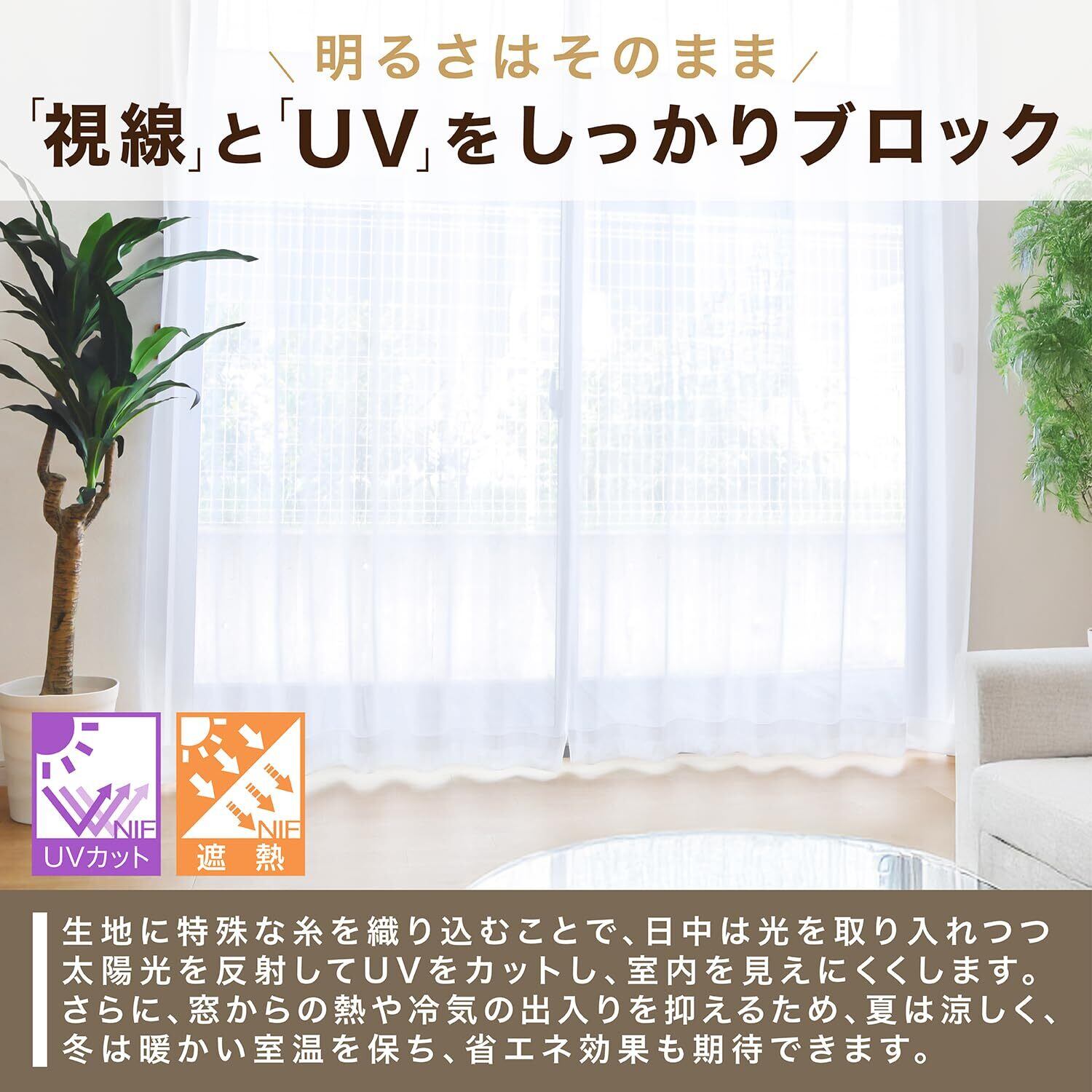 紫外線カット率は70%ですが、日中外からの視線は十分カットしてくれ、お部屋の中から外の景色を感じることができるので、夏は涼しく風通しも良く開放感があります。外からの視線は遮りたい透けないカーテンですが、外の気配が感じられないのはいやだと思われている方にお勧めです。レースカーテンの透け感を楽しんで頂けます。
