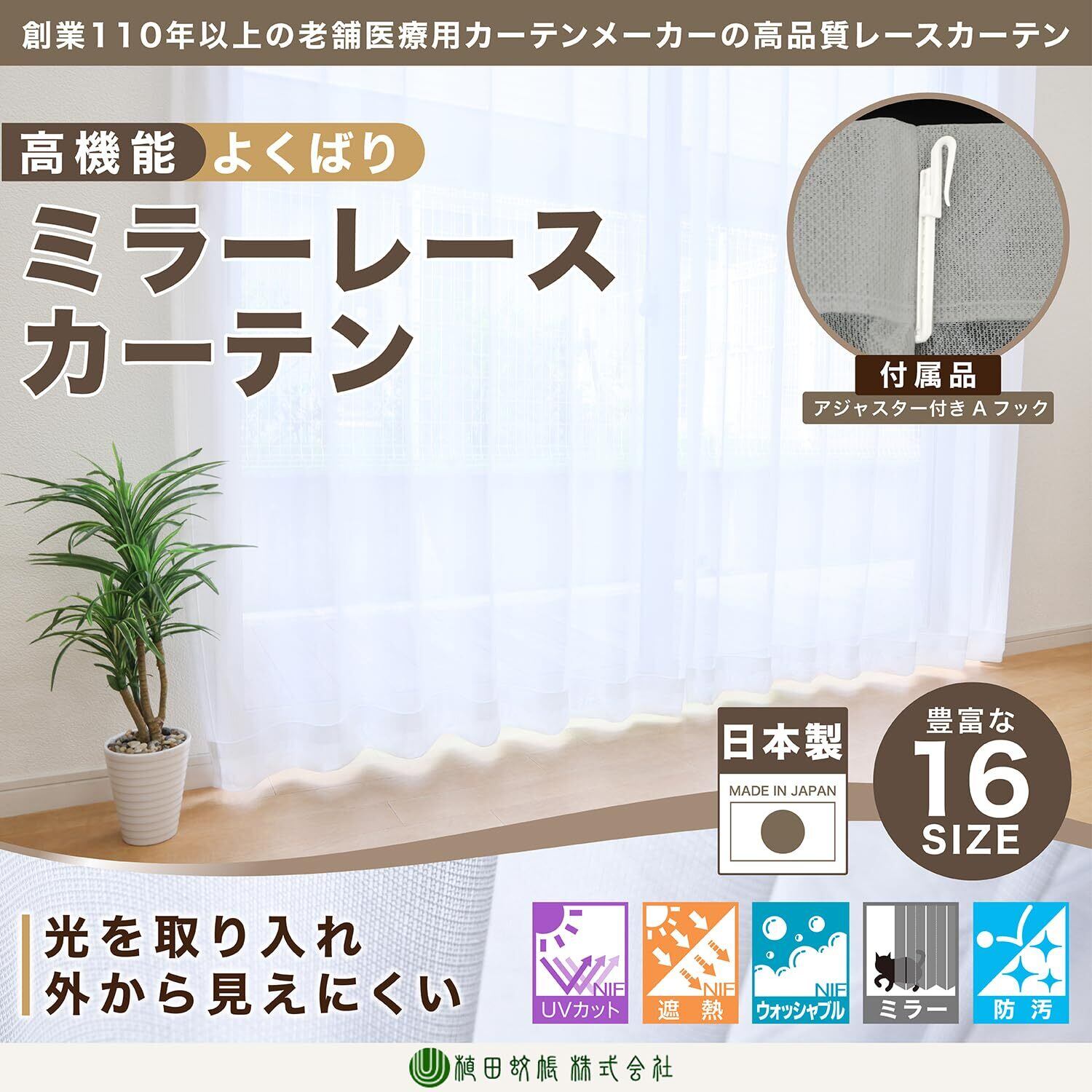 【2022最新】透けにくい UVカット 遮熱 保温 節電 防汚 洗濯OK ウォッシャブル 高機能 よくばり ミラーレースカーテン UE-597-1 医療カーテンの老舗メーカー 植田蚊帳 幅100cm × 丈176cm -2枚組