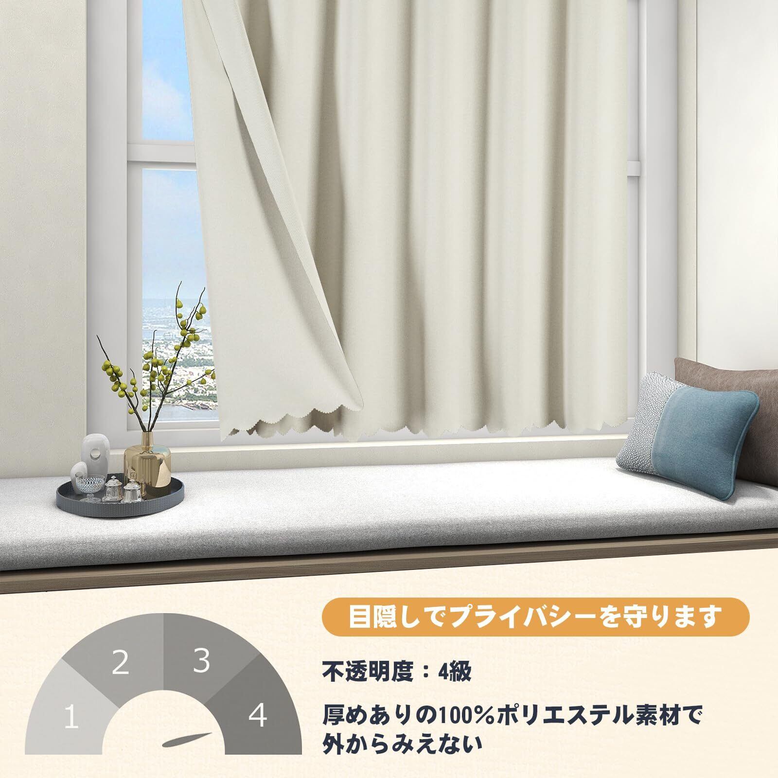 【取付方法】両端の直径2.0cm以下の突っ張り棒が使用可能です。カラー:アイボリー[遮光1級・厚め] ・ 幅60cm x 丈50cm [1枚入れ] 適応窓サイズ:幅25-55cm *別途対応可能な突っ張り棒をご用意ください。ご注意:同じ等級であっても、カーテンの明度や色彩によって遮光の度合いが変わります。薄い淡い色は光を通しやすく、濃い暗い色は光を通しにくいです。遮光性を重視される方は濃色をおすすめします。