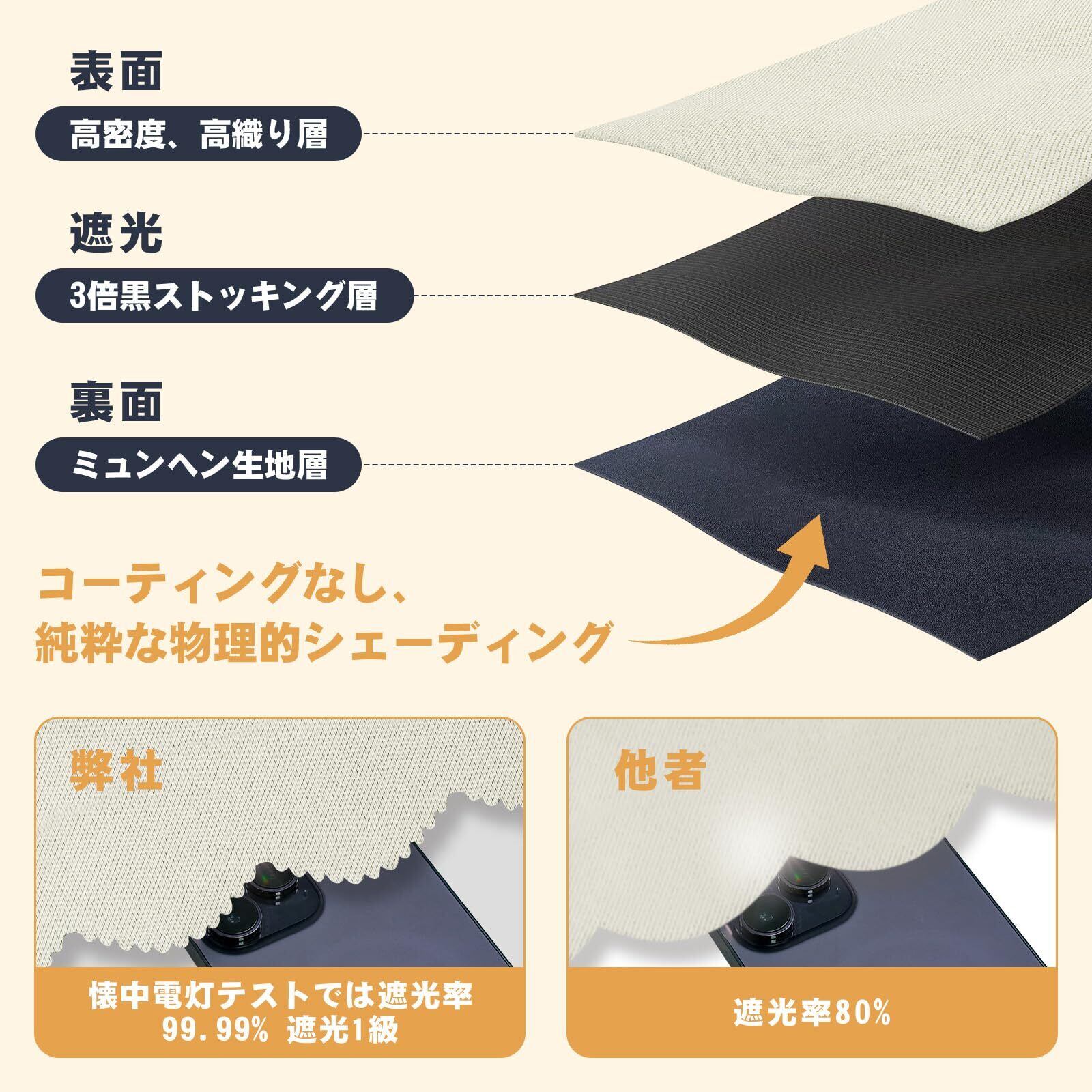 【生地】遮光1級生地(遮光率99.99%以上)を使用,外からの光をほとんど通さない、夏場の断熱効果、冬場の保温効果が期待できます。 昼間カーテンを閉めたお部屋のなかで相手の顔の表情が分からない程度にまでお部屋を暗くできます。同じ等級であっても、カーテンの明度や色彩によって遮光の度合いが変わります。薄い淡い色は光を通しやすく、濃い暗い色は光を通しにくいです。遮光性を重視される方は濃色をおすすめします。