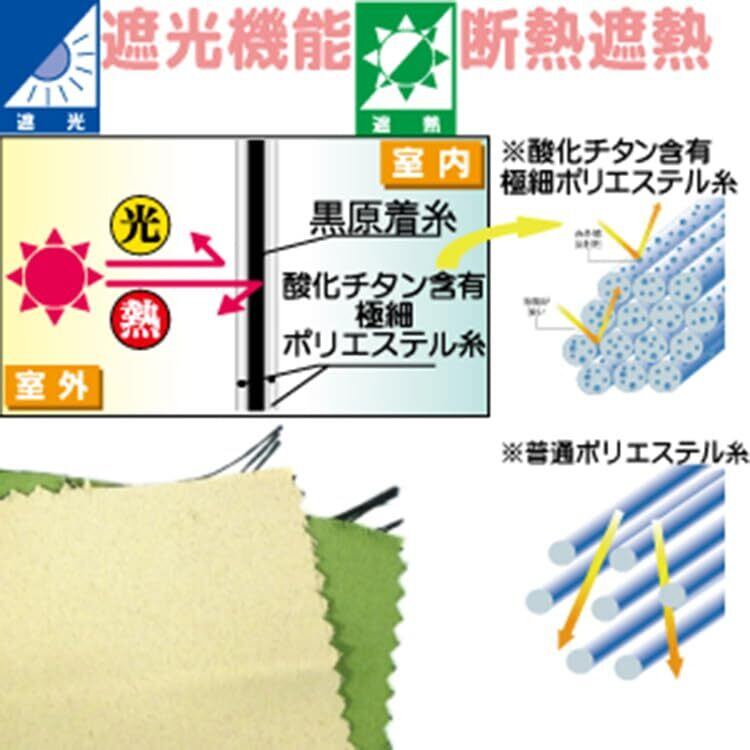 機能:遮光機能【遮光1級 遮光率99.99%】、防炎機能(消防法適合、防炎協会認定ラベル付)、断熱遮熱機能【断熱率57%(ラボ試験)】、UVカット機能、ウォッシャブル ※防炎機能はホテルや公共建物等で義務化されている防炎機能カーテンと同レベルの防炎機能です。製品のカフェカーテンには消防庁、日本防炎協会認定の防炎マーク入りのラベルが付きますので、ホテルや旅館、飲食店などの店舗、学校や公民館など公共の建物や施設、さらには高層マンション・タワーマンションなどの「高層建築物」で幅広く安心して使用していただける商品です。