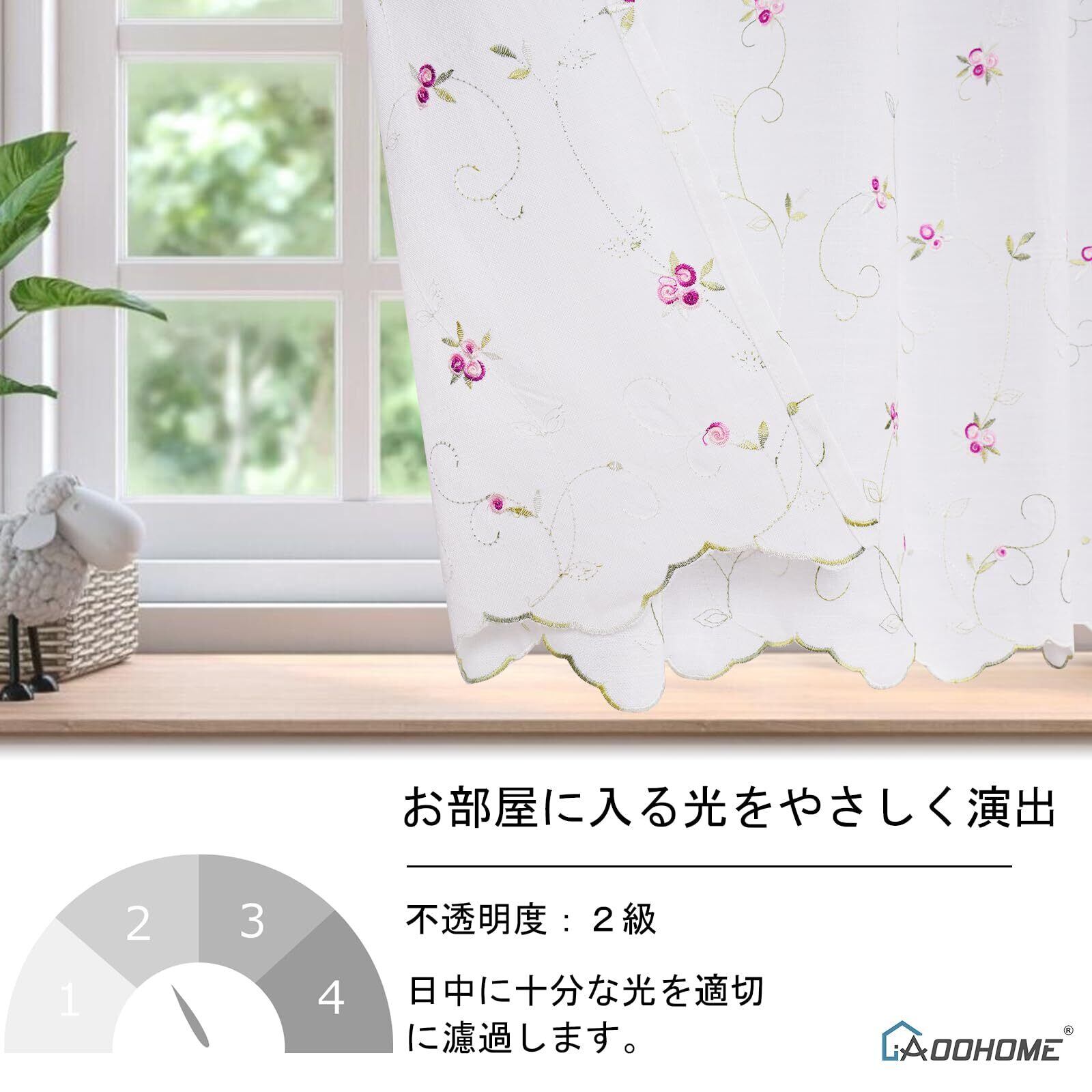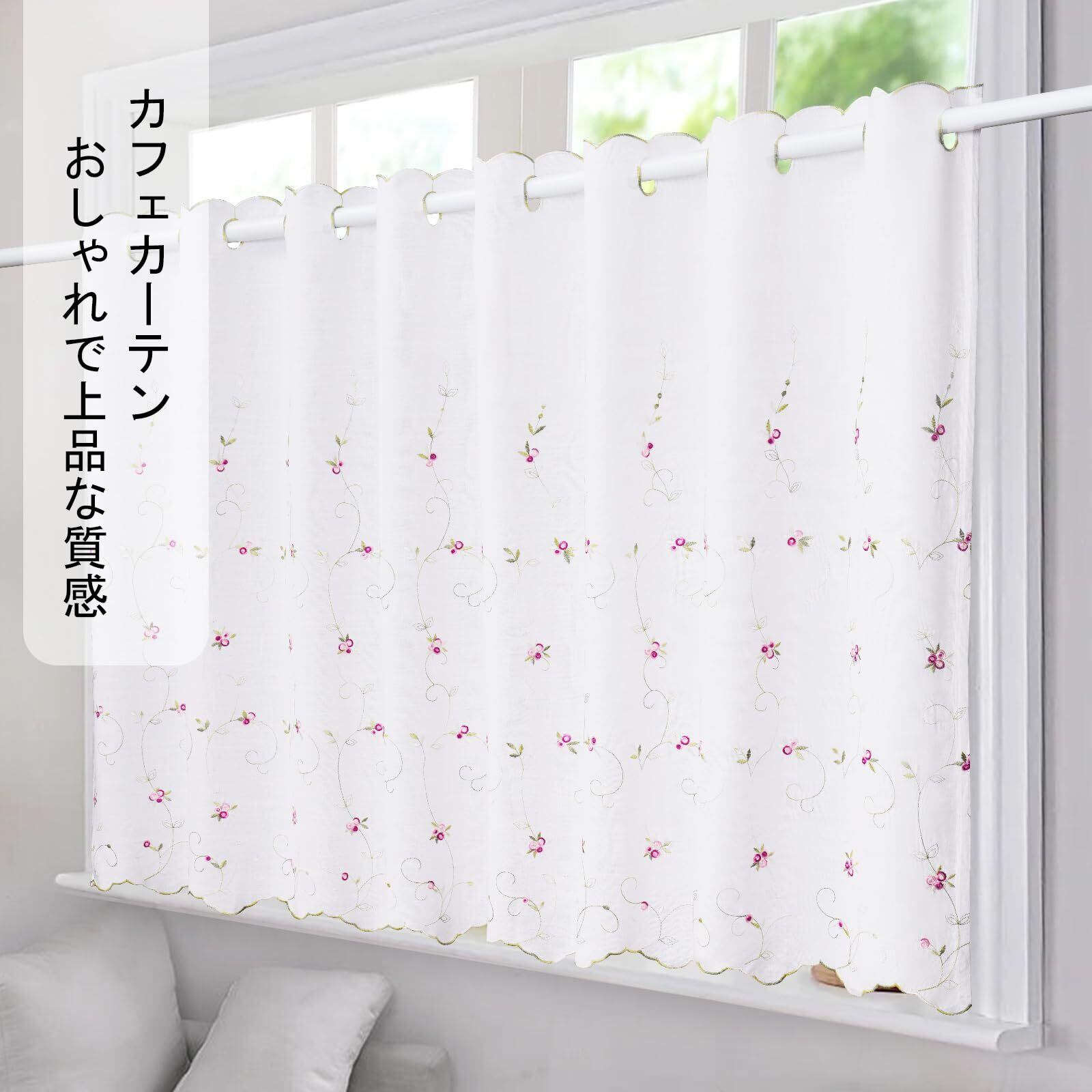 【可愛い花刺繍】可愛い花の刺繍があらわ、お部屋がが明るい雰囲気になり。目隠しでキッチンやトイレの小窓やお部屋の間仕切り等によく使っています。ドレープ感があります。