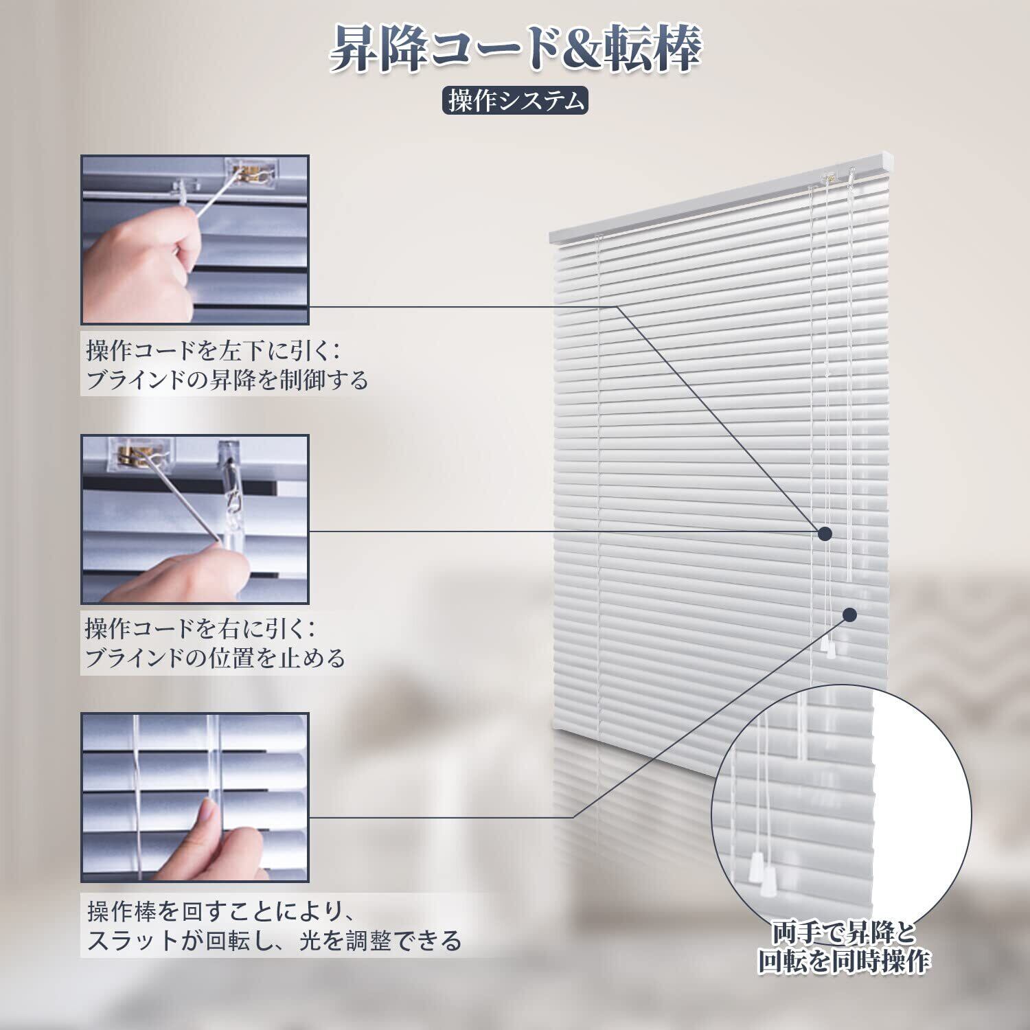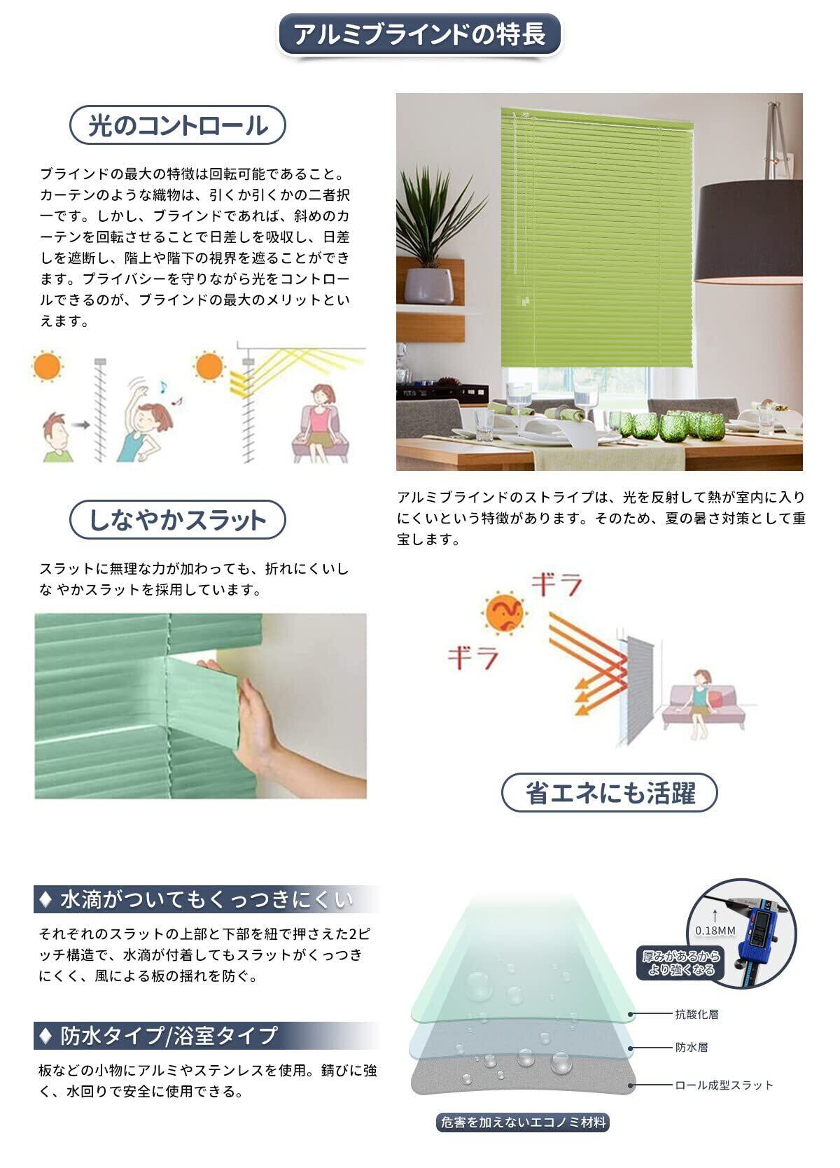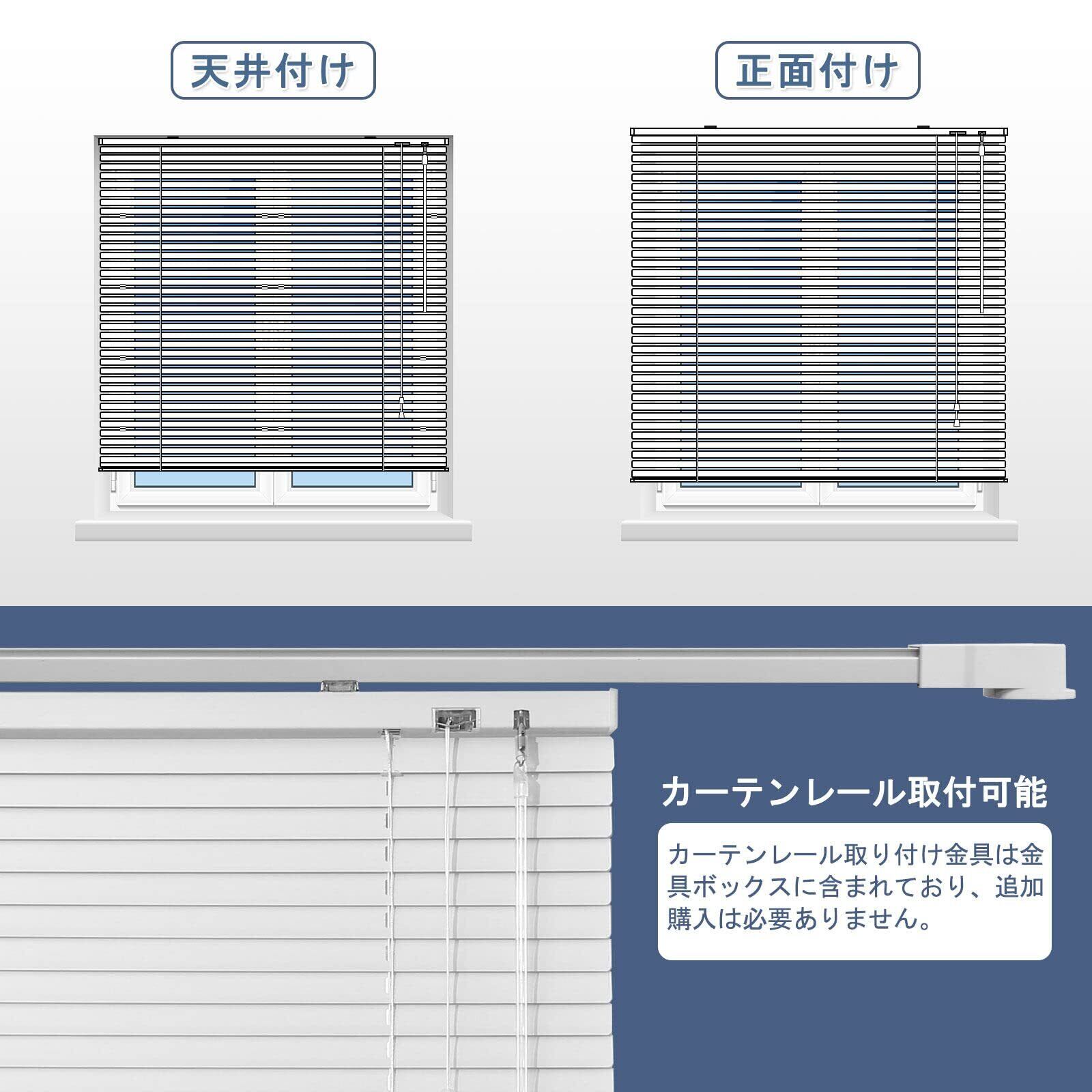 【素材】ブラインドの材質は厚手のアルミニウム合金で、羽根幅25mm、厚0.18mm。【パッケージ内容】ブラインドx1、操作棒x1、取り付け金具&カーテンレール取付金具。【簡単取付け】天井付け、正面付け、ランナータイプのカーテンレールへのお取り付けが可能です。