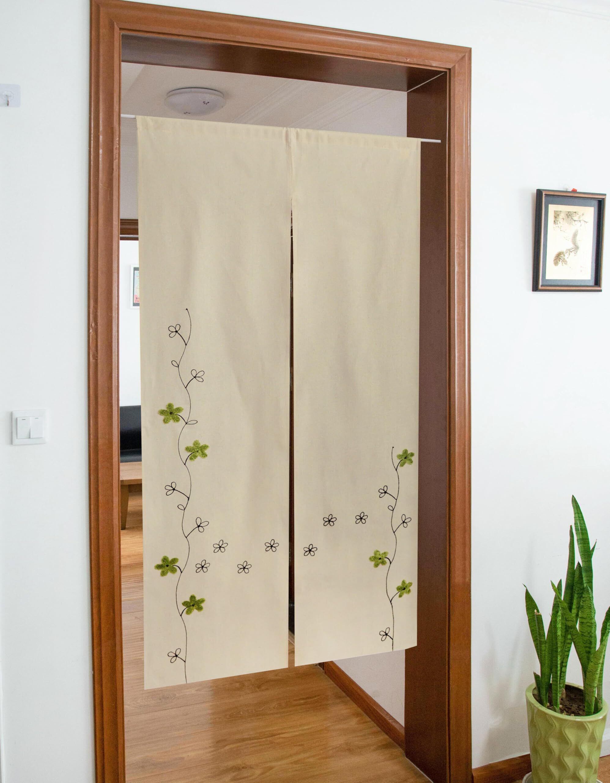 生地にグリー葉っぱ柄のコード刺繍がついて、うつくしくて、春夏を楽しみにしています。暖簾棒は附属されておりません。