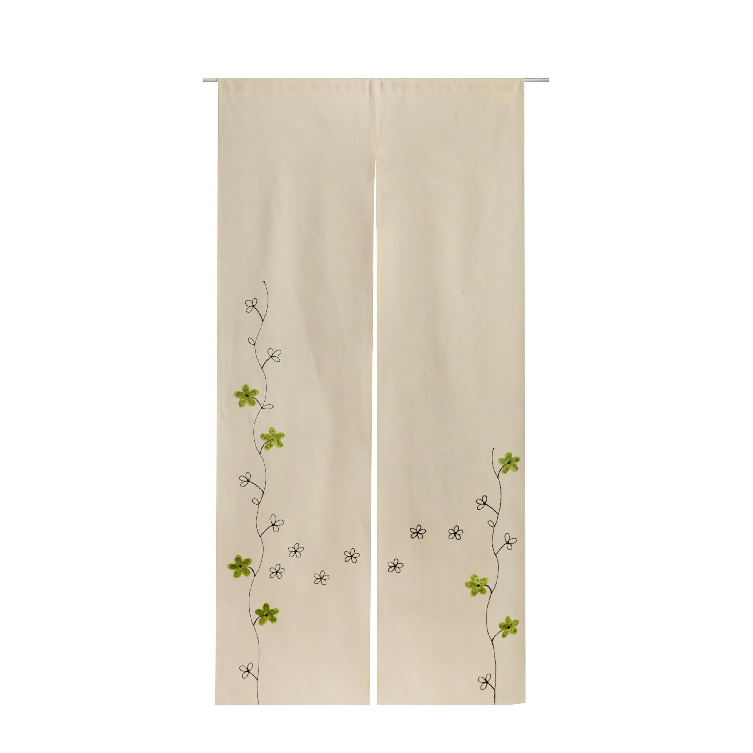 YURLISA麻風のれん ロング刺繍入りML102(グリーン刺繍, 幅85㎝x180㎝丈)