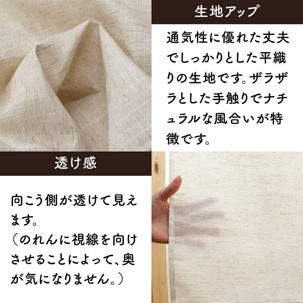 【ポイント】選りすぐりの麻混生地を使用した、麻の質感が味わえるのれんです。おしゃれな透け感で優しく光を取り込みます。また、圧迫感も軽減します。和室や洋室にはもちろん、店舗や飲食店にもおすすめです。また、海外へのお土産やプレゼントなどにもおすすめです。