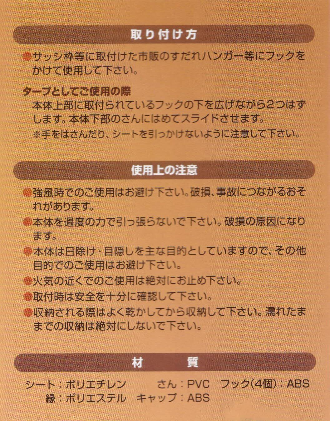 【すだれ専業の水勘製簾所製】 国内の老舗、簾メーカーが手がける高品質な日よけアイテム。生産国:中国 、材質:本体:ポリエチレン 上下桟:PVC 縁:ポリエステル キャップ:ABS フック(4個):ABS