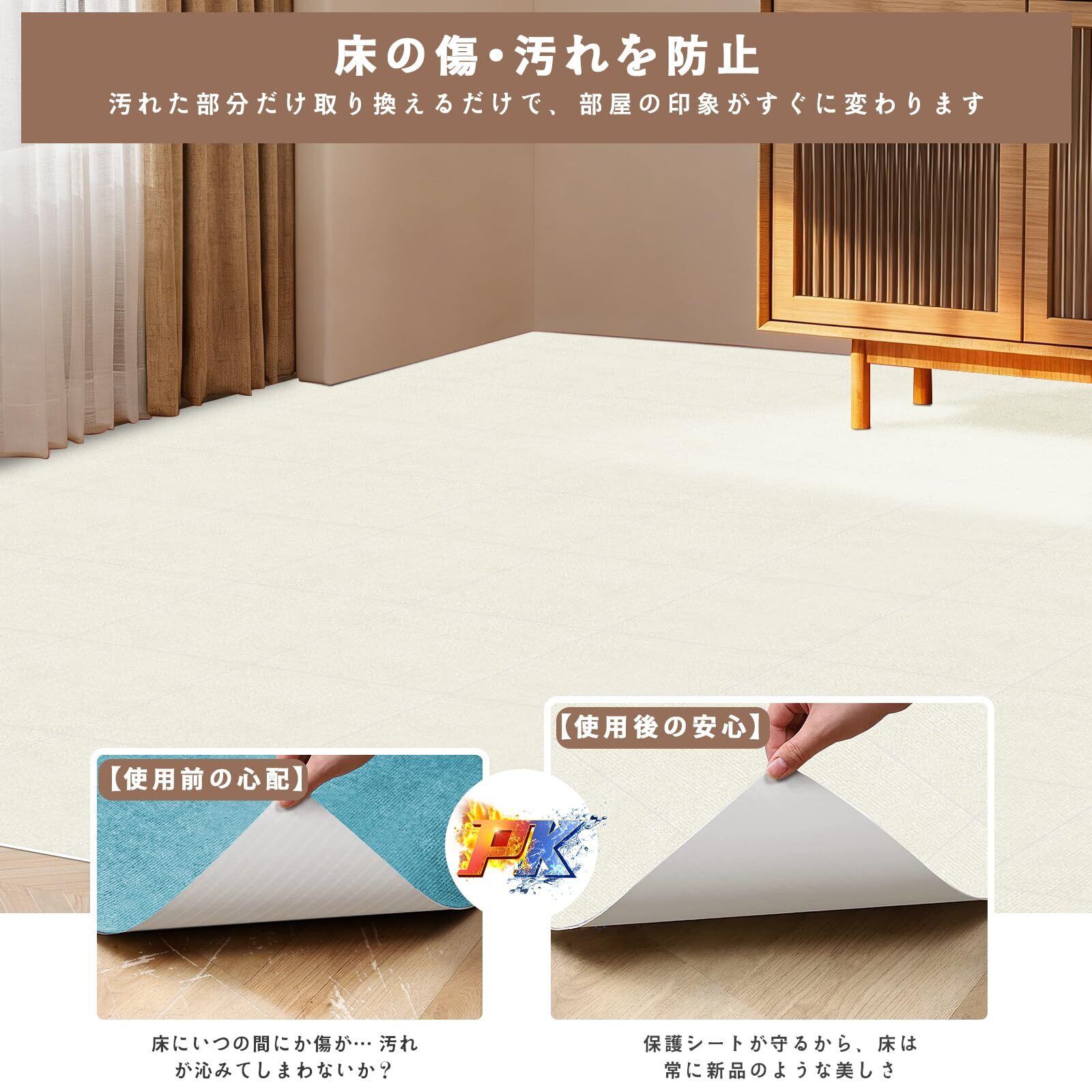 【カットが便利で、床の傷を減らす】パンチ・タイルカペットは好きな形にカットすることができ、カットすることで、家の隅々や角をカバーすることができ、創造力を発揮することができ、パンチ・タイルカペットをどんな形や模様にカットしても、部屋に芸術的な模様を加えることができます。使用前に床をきれいに拭き、パンチ・タイルカペット背面のフィルムをはがして床に吸着してください。パンチ・タイルカペットは自分だけでなく、友人への引越しプレゼントにも。パンチ・タイルカペットは床に吸着し、床を保護し、床のスクラッチ傷を減らす