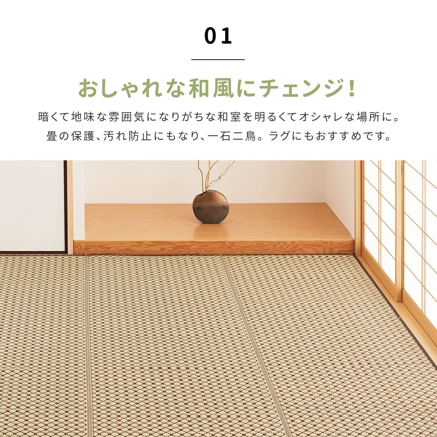 萩原 洗える い草風カーペット ルイス グリーン 江戸間6畳 約261X352cm 柄上敷き 花ござ ラグ 和モダン