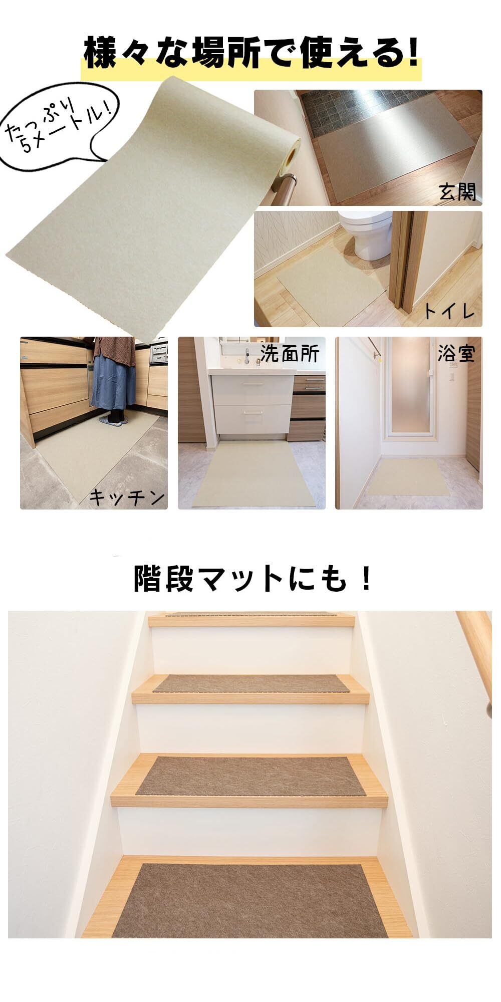・5メートルのロールをお好みの大きさにカットできるから玄関、キッチン、廊下、階段など様々な場所でお使いいただけます。