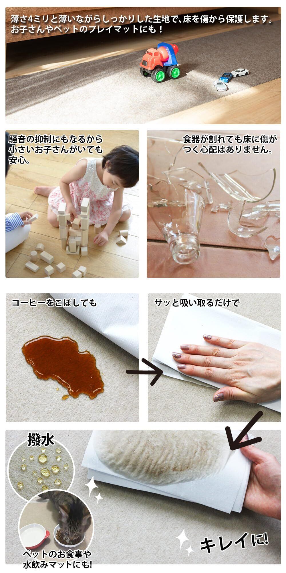 ・薄さ4mmと薄いながらしっかりした生地で床を傷から保護します。お子さんやペットのプレイマットにも。衝撃を吸収!騒音の抑制・床の保護に最適です。