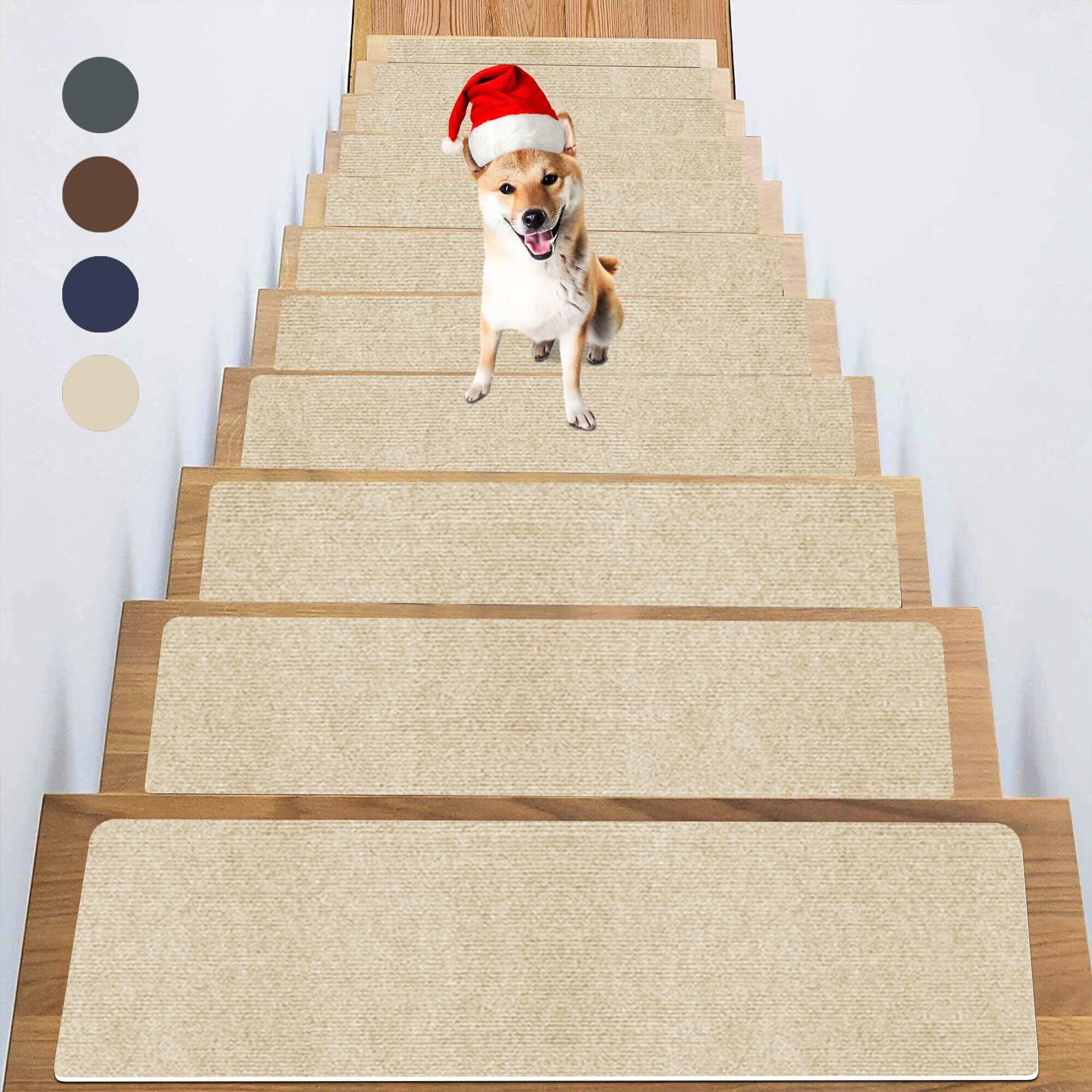 ●【自由に裁断·階段の色にばっちり】サイズ:70 x 22 cm、15個入り。 素材:表:ポリエステル、裏:ポリウレタン。 カラー:ベージュ/ダークグレー/ブラウン、3色からお選びいただけます。さまざまな色のフローリングに最適で、スタイリッシュでシンプル、決して時代遅れではありません。 猫犬階段滑り止めマット接着が簡単,階段の大きさに合わせて自由にカットできます。