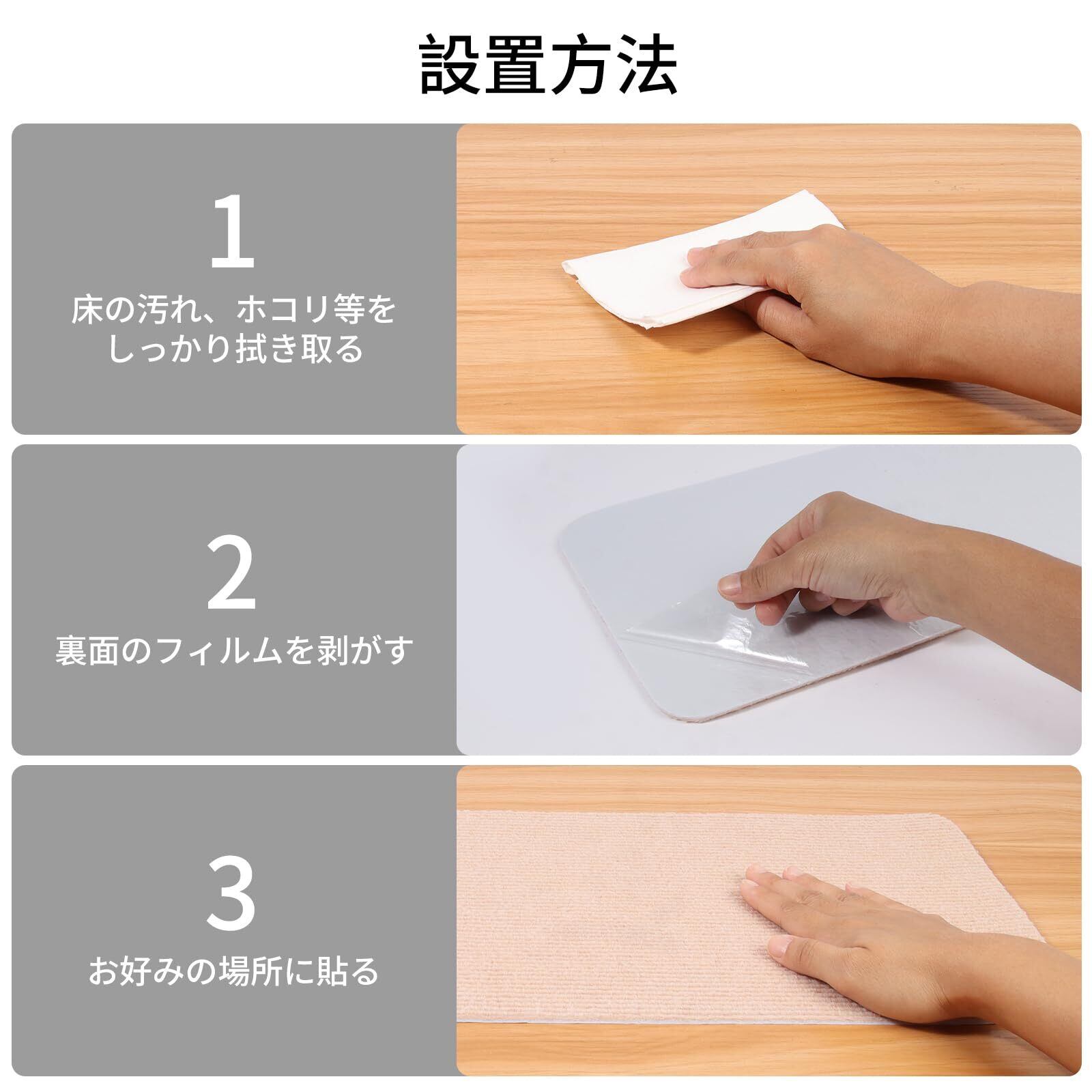 【清潔しやすく、繰り返し使用可能】床を掃除後、製品の下のフィルムを剥がし、マットを片側から押し付けて、階段にしっかりと吸着させます。日常的にホコリや汚れをブラシ等で掃除してください。汚れた場合は、手洗いまたは洗濯機で洗濯可能です。水で洗える階段マットで、何度も洗濯・乾燥させて繰り返し使用できます。