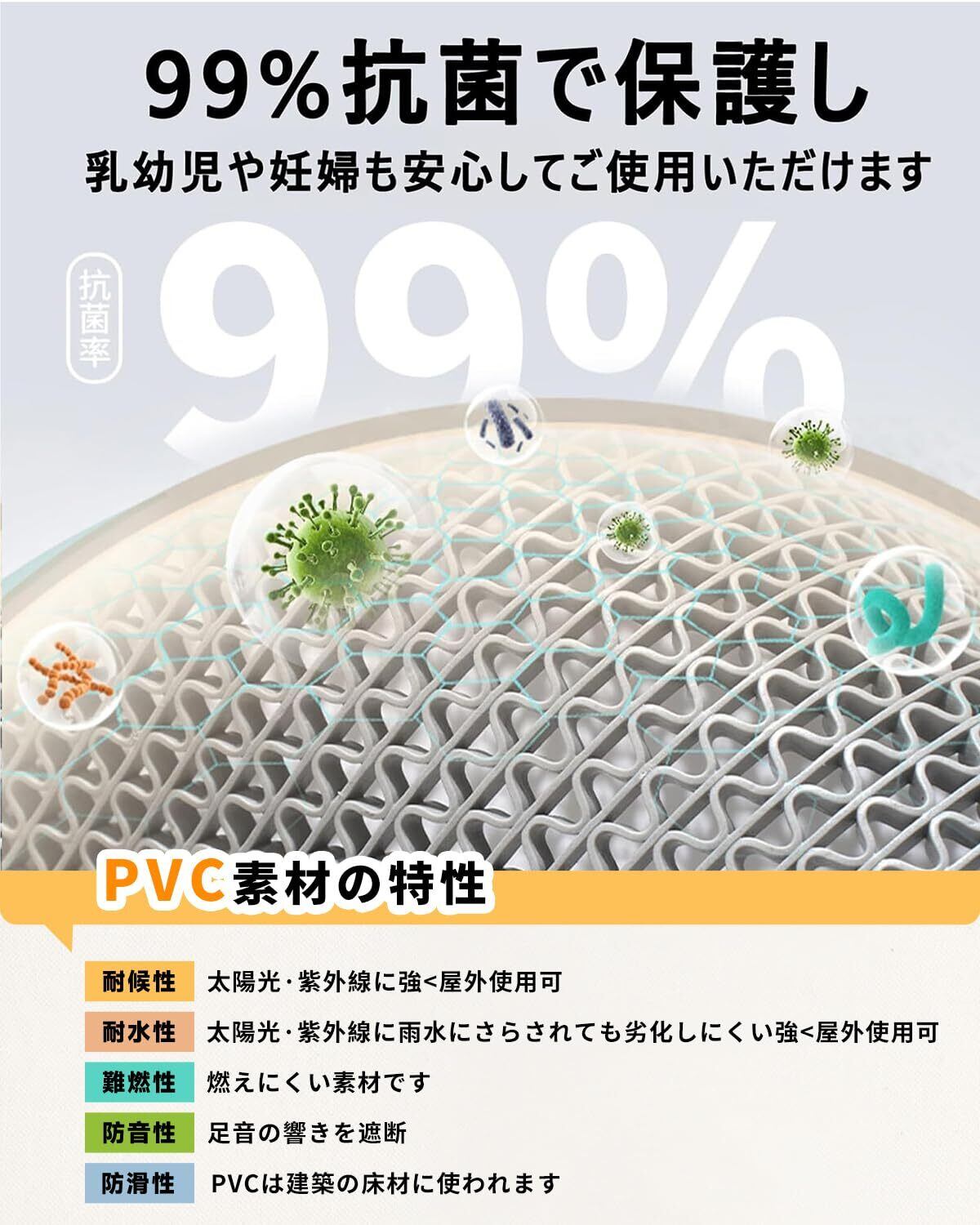 【耐摩耗性・耐老化性】:この滑り止めゴムマットは環境に配慮したPVC素材を使用し、防水性、紫外線耐性、耐摩耗性に優れています。無臭で、快適な足触りを提供し、長時間の立ち仕事や歩行による疲れを軽減します。耐老化設計により色あせを防ぎ、日光や長期使用による老化を防止し、寿命を延ばします