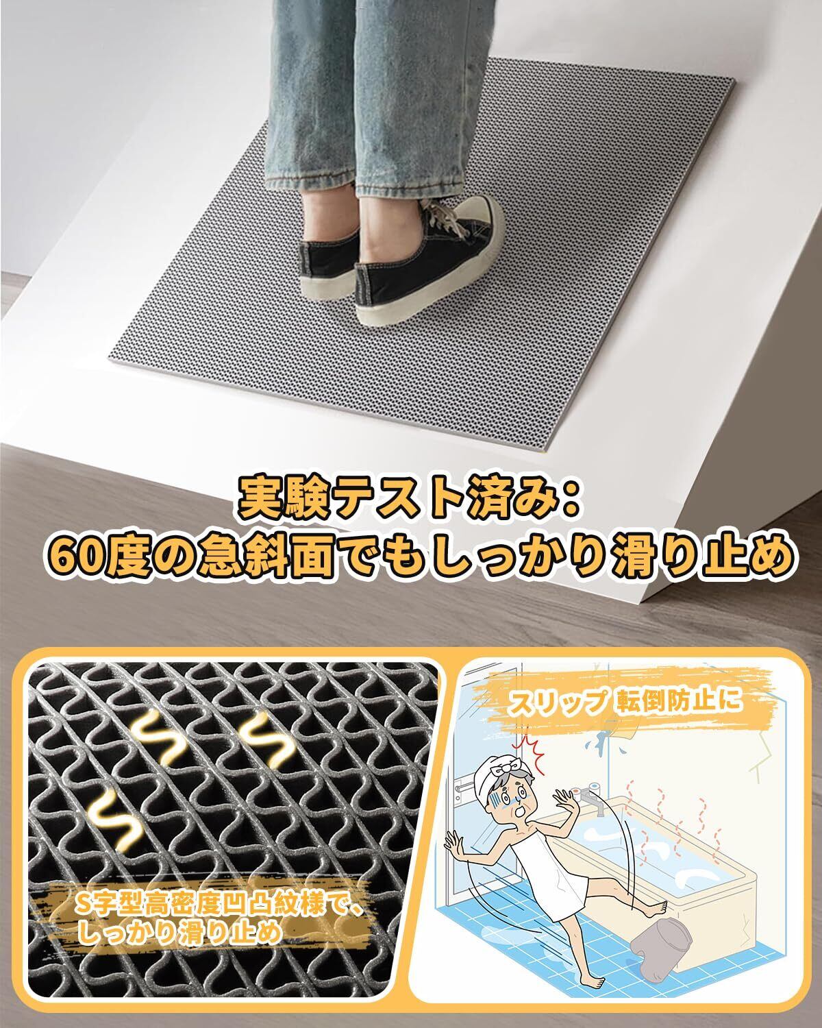 【転倒・滑り防止】:この滑り止めマットは、湿気や滑りやすい場所での転倒を防ぐために設計されています。マット全体がS字型のハニカム構造を持ち、浴室やプールサイドなどでも優れた滑り止めテクスチャーにより安定したグリップを提供し、滑りのリスクを回避します。防滑係数テストをクリアしており、木製デッキ、濡れた木の床、玄関、出入口周辺、傾斜のある滑りやすい場所、タイル、コンクリート、石材の床、金属板、格子状の床など、様々な地面で効果的に滑り止め効果を発揮します