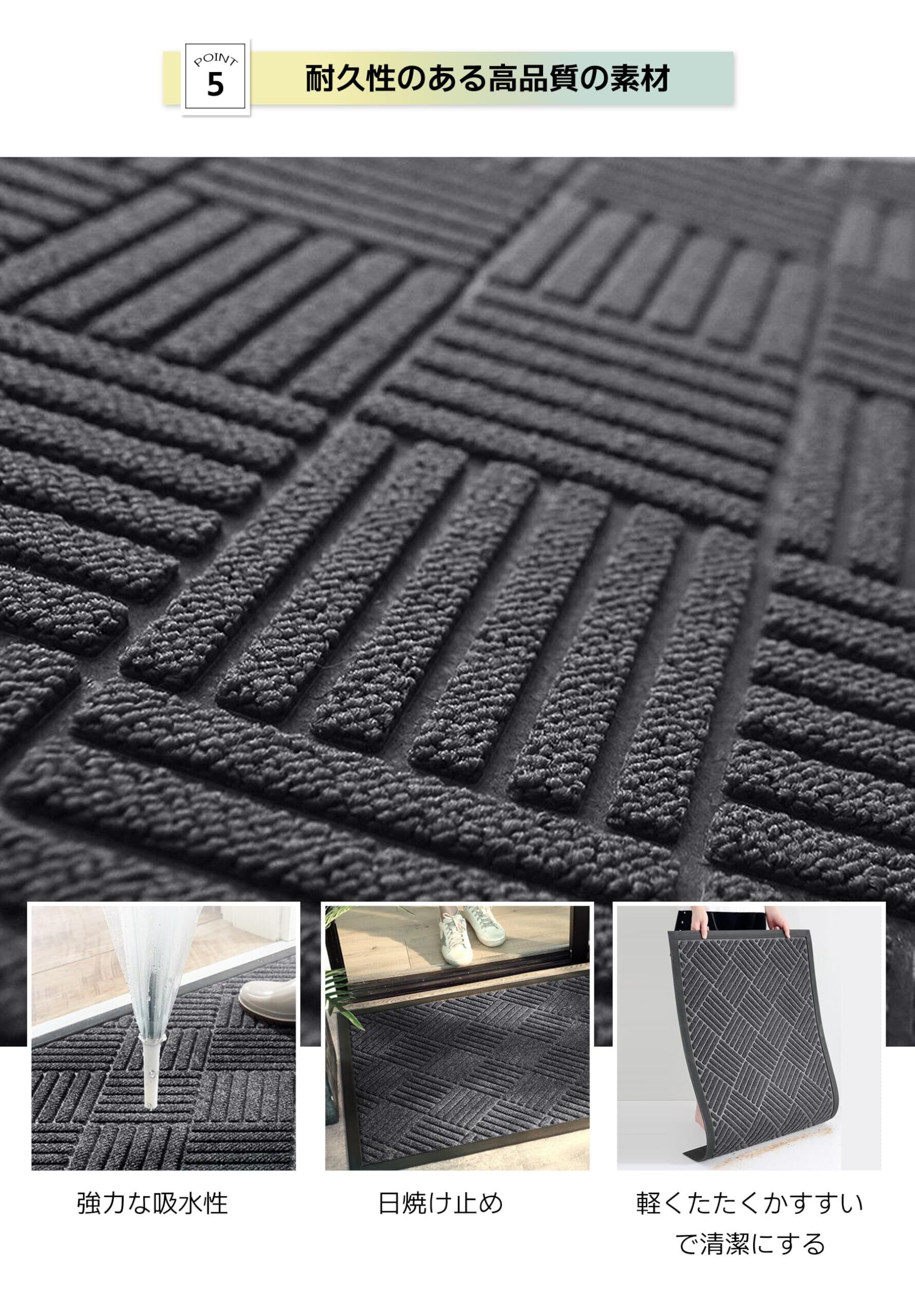 【泥落とし・吸水】室内でも屋外でも使える玄関マットです。凹凸のある表面が、家の中に持ち込みたくないホコリや汚れ、水などの雜質をしっかりキャッチして吸収する機能的なマットです。長雨や大雪の日でも床の汚れを最大限に抑えます。