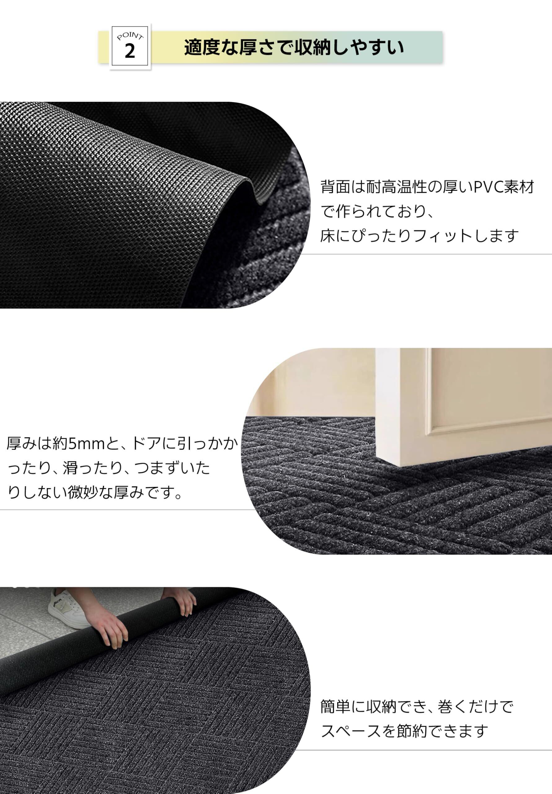 【製品仕様】サイズ:60cm×90cm。マットはポリエステル(裏地:塩化ビニル樹脂)製で、ストライプ構造になっているので耐久性に優れています。厚みは約5mmと、ドアに引っかかったり、滑ったり、つまずいたりしない微妙な厚みです。