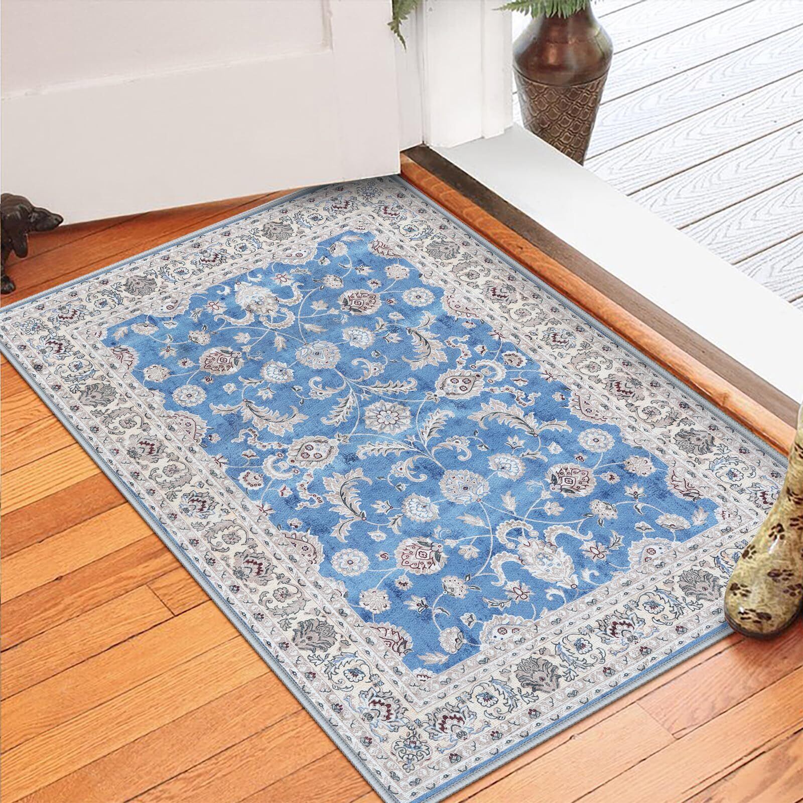 【在庫処分】HAOCOO 玄関マット ペルシャ絨毯風 室内 50х80cm 小さい ラグ おしゃれ 洗える 長方形 耐磨耗性 滑り止め 防音 ラグマット 屋外 泥落とし シェニール オールシーズン適用 抗菌防臭 軽量 ライトブルー