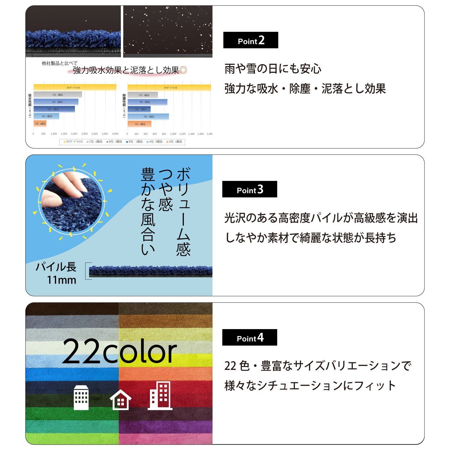 【機能】除塵・泥落とし・吸水性能に優れた万能タイプの玄関マット。1㎡あたり約4リットルの吸水量があります。選べる22色展開、あらゆるフロアにマッチします。