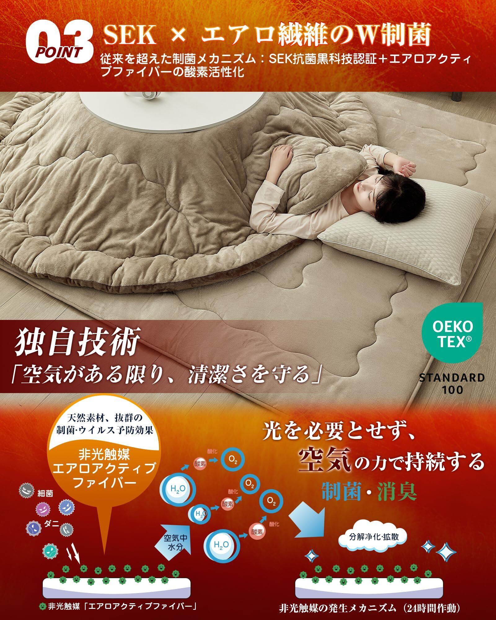 【SEK抗菌防臭×非光触媒のW制菌】SEK認証済みの素材に、エアロアクティブファイバーの酸素活性化技術を組み合わせることで、空気がある限り24時間持続的に制菌・消臭を発揮。低ホルムアルデヒド設計で、お子様にも配慮した仕様です。洗濯を繰り返しても抗菌・防臭・防ダニ効果が持続。