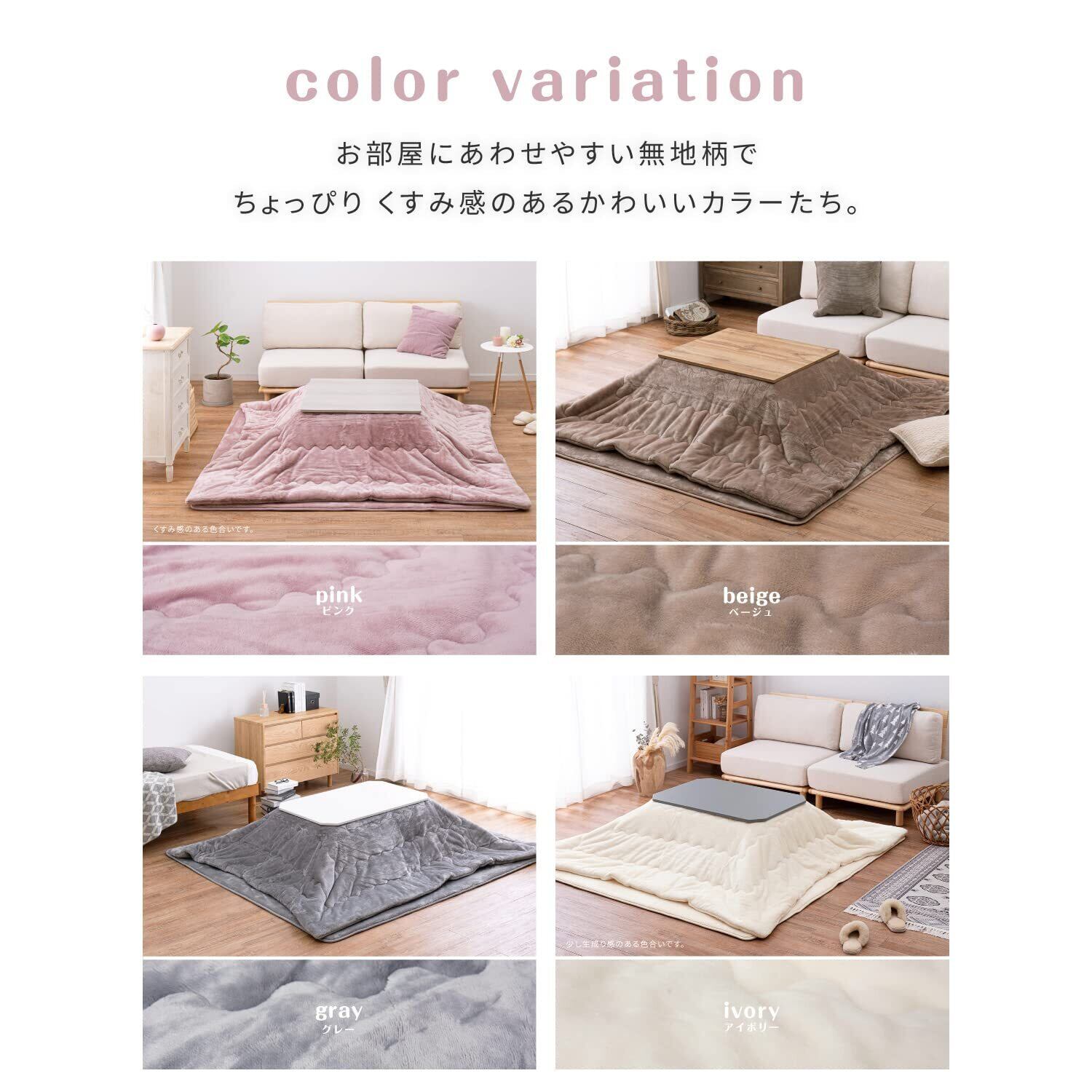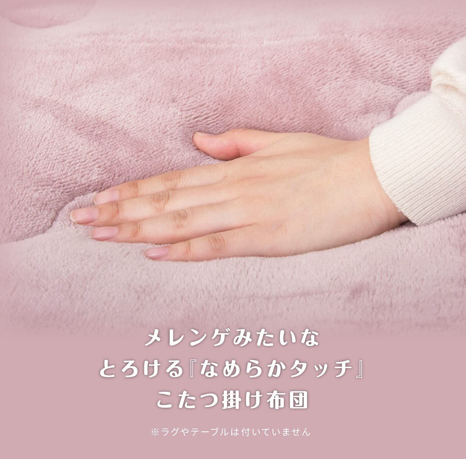 思わず触れたくなるようなふんわりなめらかタッチのこたつ掛け布団です。。裏表に同じ生地を使用しています。天板などのズレを気にせず使えたり、取れない汚れが出てきたら裏返して使えたり、リバーシブル仕様で長くお使いいただけます。また、波型縫製で中綿がズレにくくキレイな形を保つように仕上げています。
