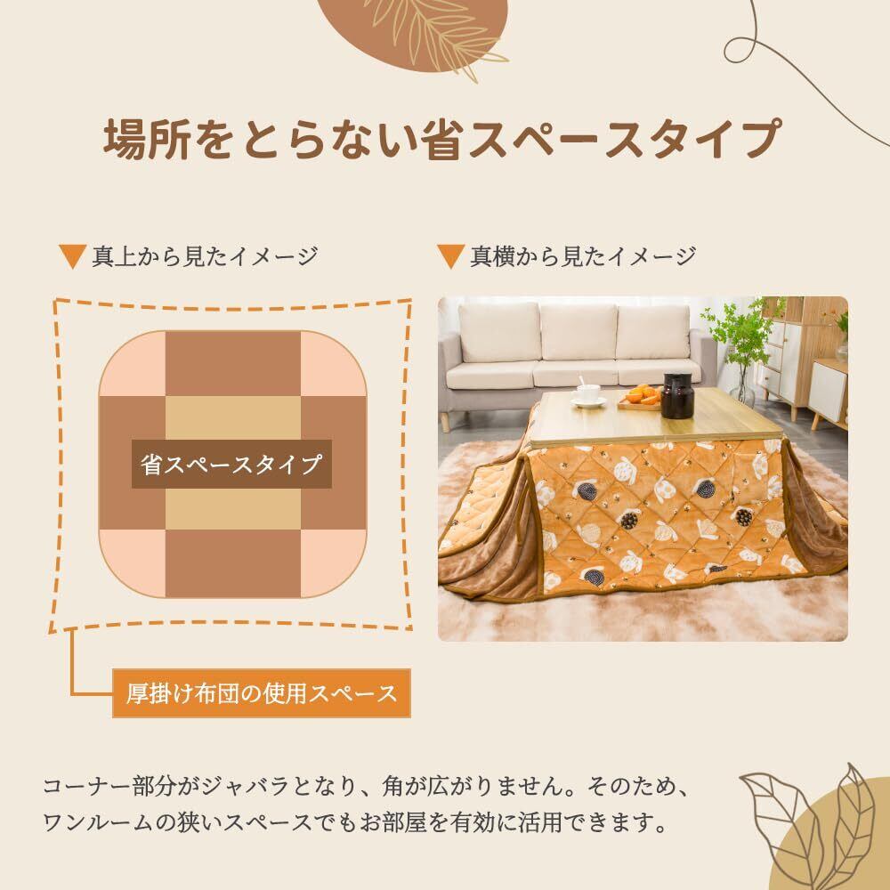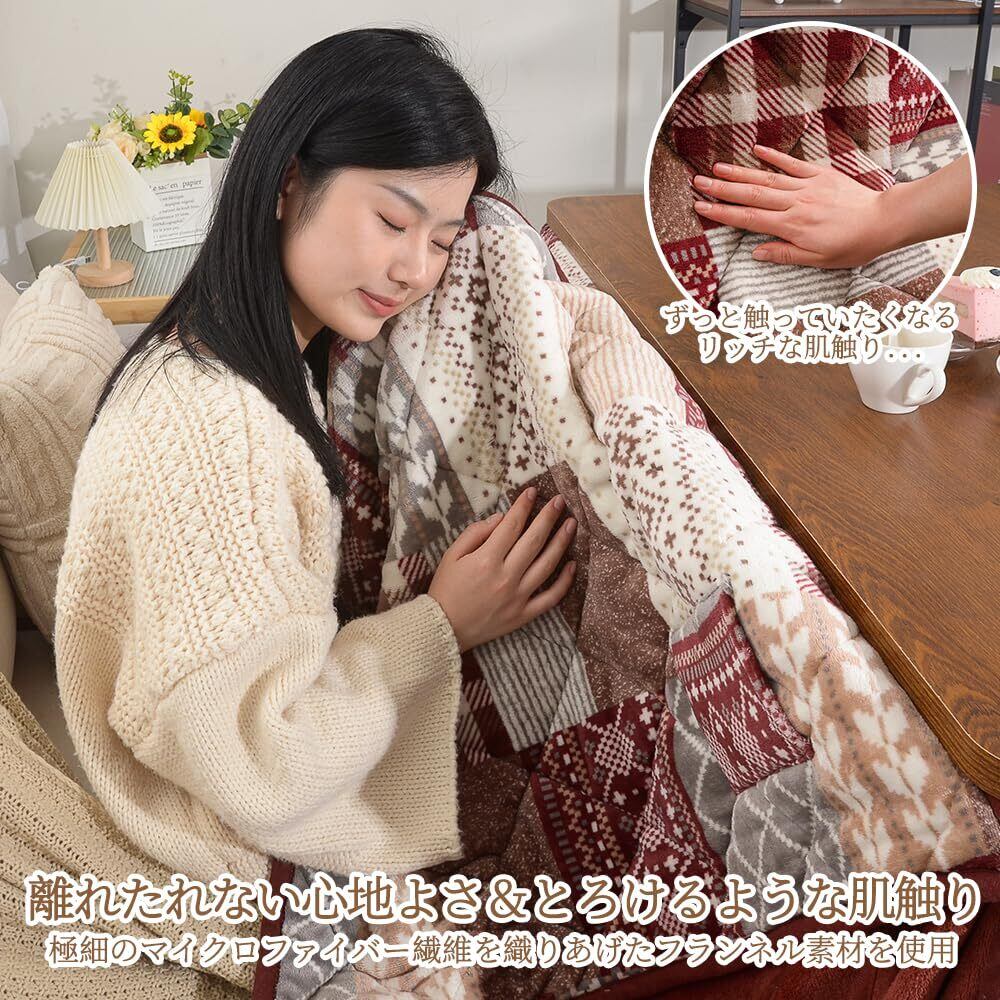 【楽しめる触り心地】表地・裏地とも、フランネル生地生地を使用しており、ふんわり柔らかな肌触り。北欧テイストやナチュラルなインテリアとも相性抜群。薄掛けタイプはこたつ周りをすっきり見せてくれ、こたつの中をぽかぽか暖めてやさしく包み込んでくれます。