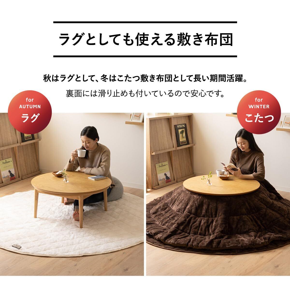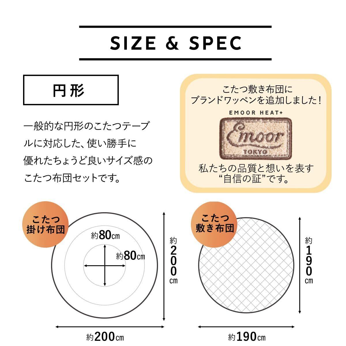 【サイズ】<円形>こたつ掛け布団:直径 約200cm/こたつ敷き布団:直径 約190cm 【こたつ掛け布団】表地:ポリエステル100%(280g/m² ロングパイルフランネル8mm エムールヒートプラス使用)/中材:ポリエステル100%/裏面:ポリエステル100%(マイクロフリース)