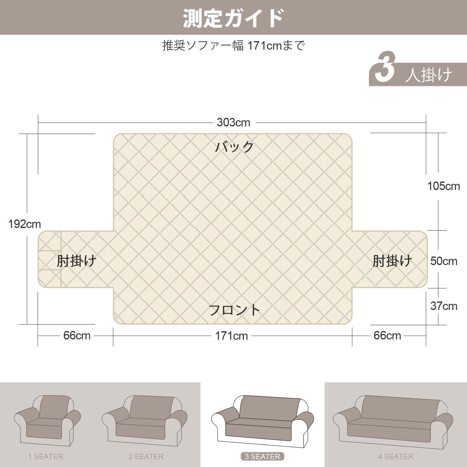 【サイズ】TAOCOCO 防水 ソファカバーは一人掛け:面積は192*188cm、二人掛け:面積は192*252cm、三人掛け:面積は192*303cm。※人工測量なので、多少の誤差がある場合がございます。ご購入前に、ソファーのサイズを測ってから、参考サイズに合わせてください。必ずソファーのサイズを測ってください。