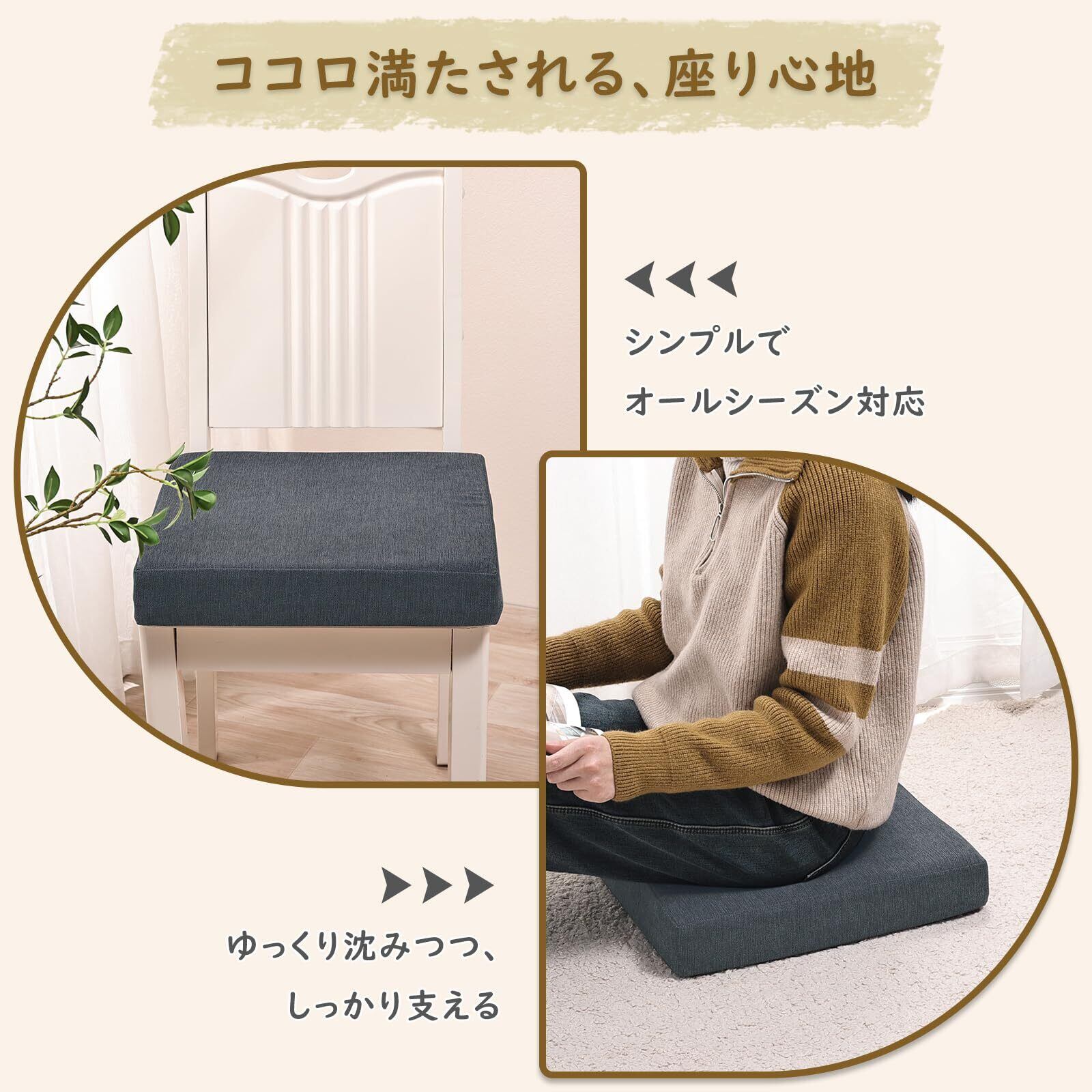 【2層構造】2cm低反発ウレタン+5cm高反発ウレタンでゆっくり沈みつつ、しっかり支えられます。お長く座っても座り心地よい。