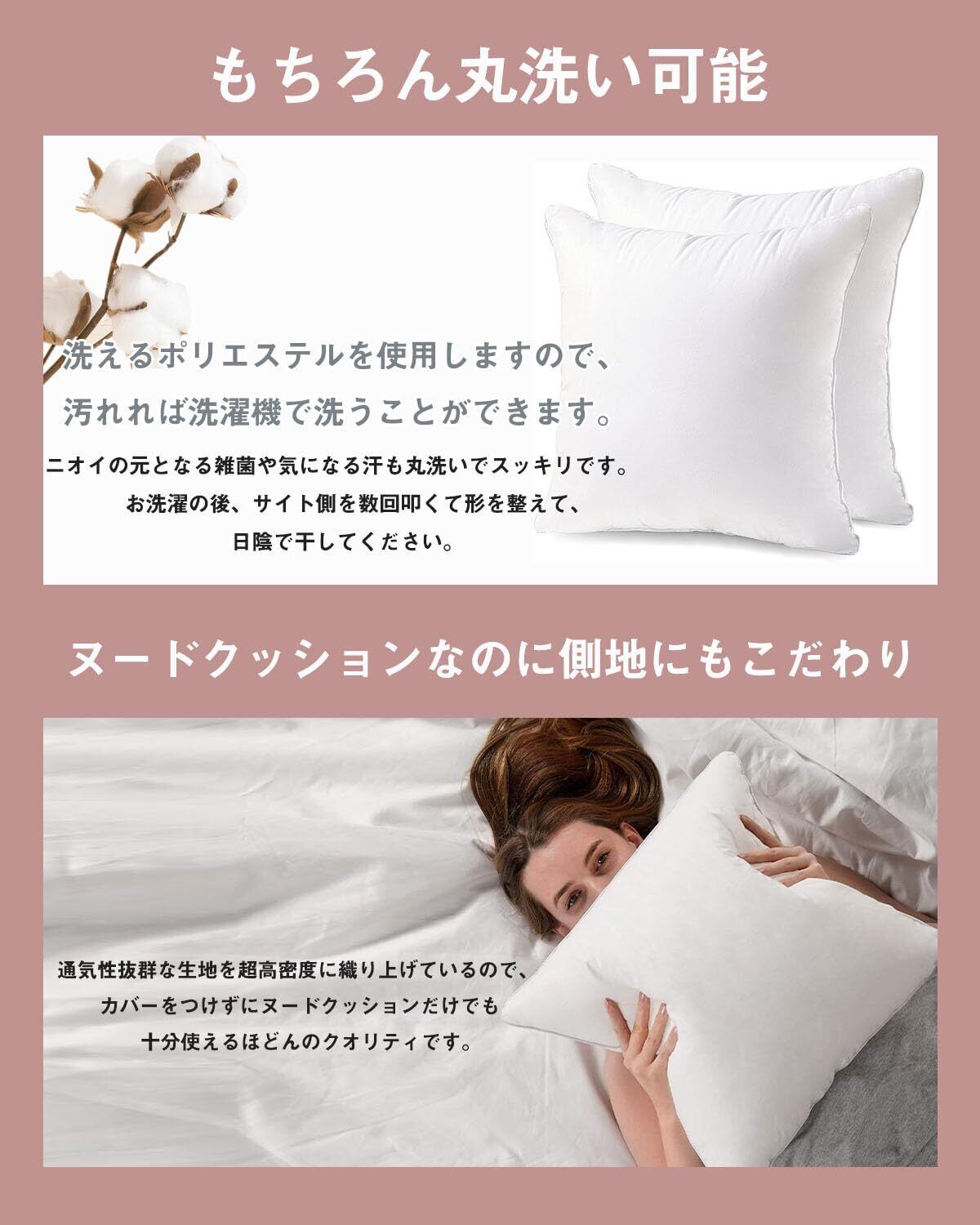「ホテル級!ふんわり気持ちいい」 素材がポリエステル100%で、通気性と吸湿性が優れて、肌に優しい敏感肌にも大丈夫です。グーッと沈みこむようなしっかりとした弾力があり、寄りかかった時に安定感があります。座布団として使っても、従来のクッションより底付き感がないので、お尻が痛くならないと感じる方も多くいます。長期間使用しても型崩れが起きにくいです。*商品には個体差があります。複数個ご注文いただく場合は、ボリューム感やにおいなどにそれぞれ違いがある可能性がございますことを、あらかじめご了承くださいませ。