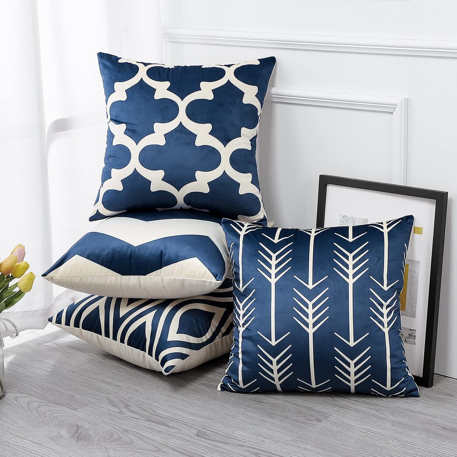 OTOSTAR クッションカバー 北欧 4枚セット 45×45cm ベルベット 可愛い おしゃれ 柄 チャック モダン 家庭装飾 飾り インテリア ソファー用クッションカバー ソファ背当て くっしょんかばー 装飾枕カバー 座布団かばー 枕カバー (幾何学ネイビー)