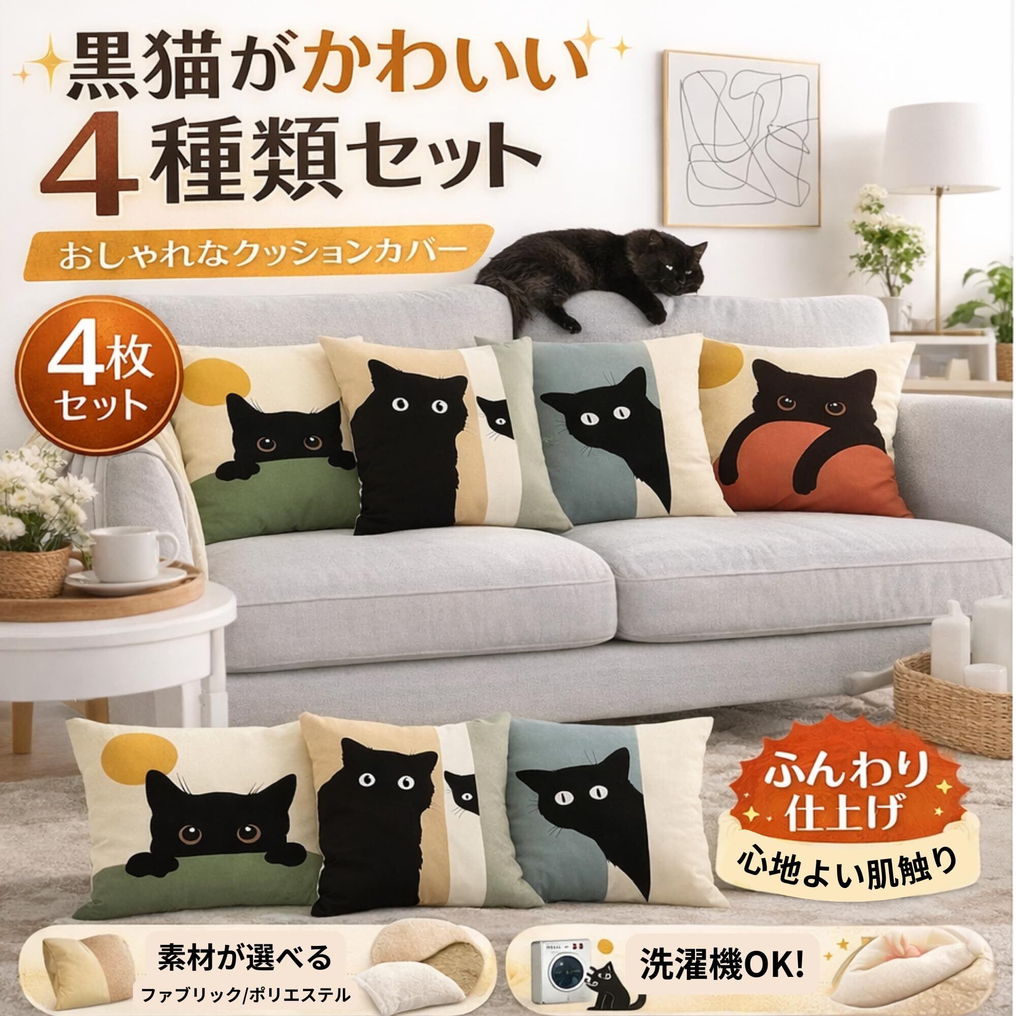 クッションカバー 猫 45×45 4種セット 猫柄 おしゃれ 北欧 クッションカバー猫45 (柔らかファブリック素材, 1)