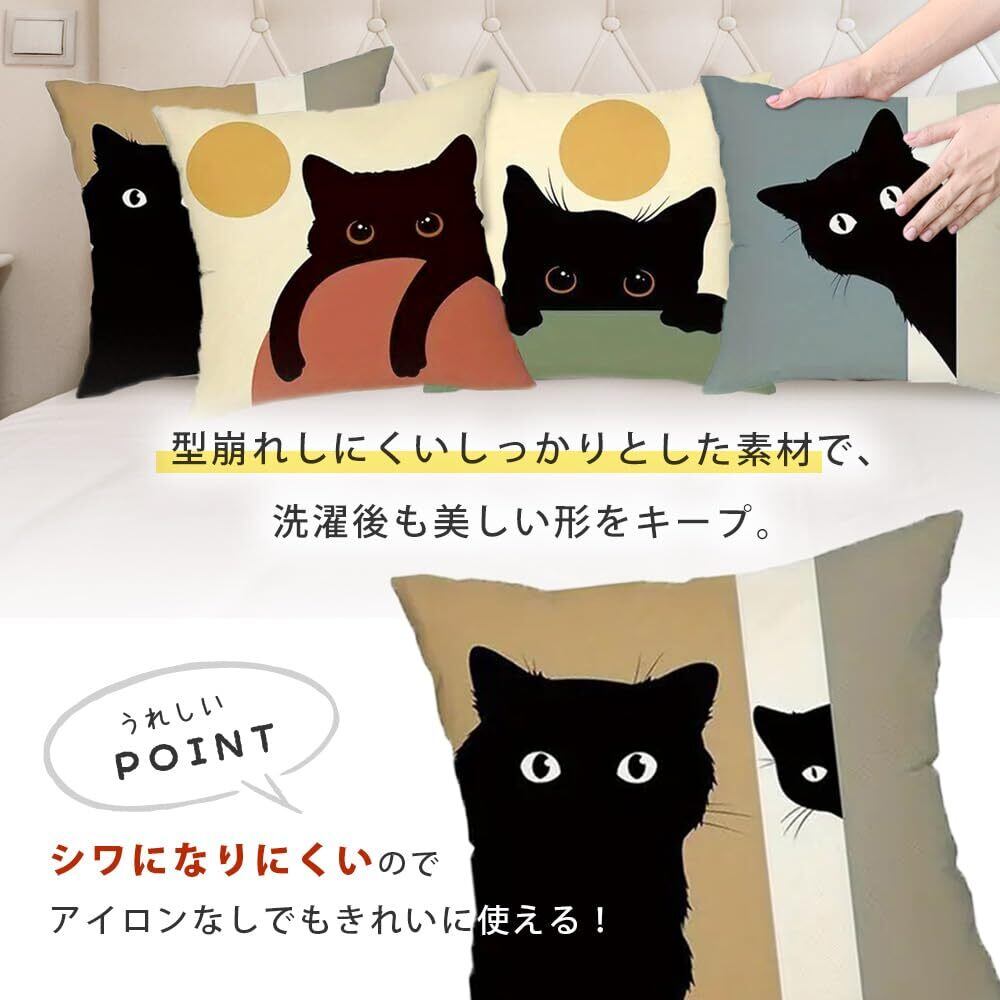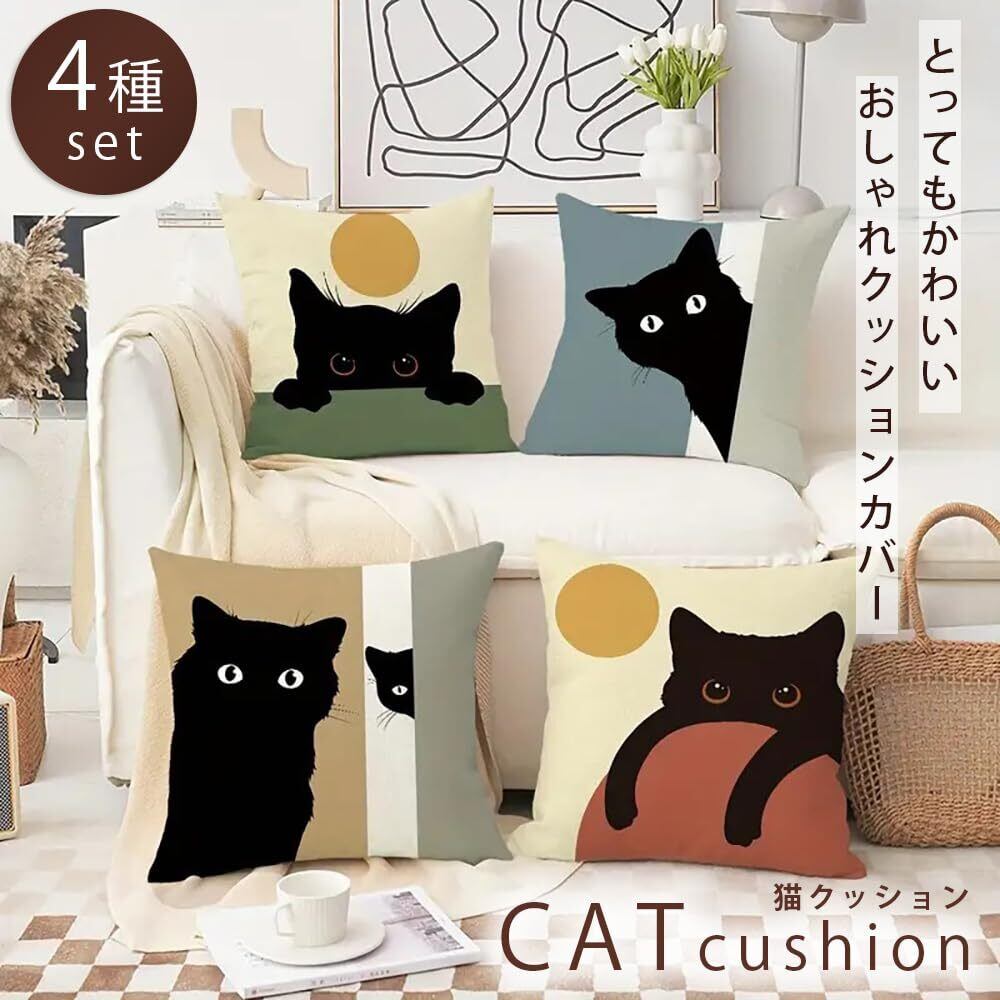 【2022最新】クッションカバー 猫 45×45 4種セット 猫柄 おしゃれ 北欧 クッションカバー猫45 (柔らかファブリック素材, 1)