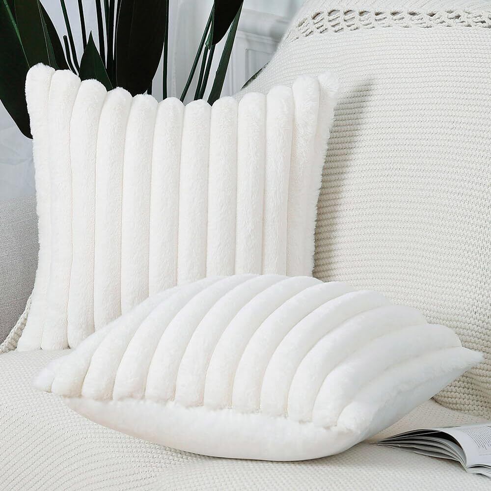 MADIZZ 2枚セット フェイクファー プラッシュ スローピローカバー ふわふわストライプ ソフト装飾クッションカバー ソファ ベッドルーム ピローシェル用 45 x 45 cm クリームホワイト