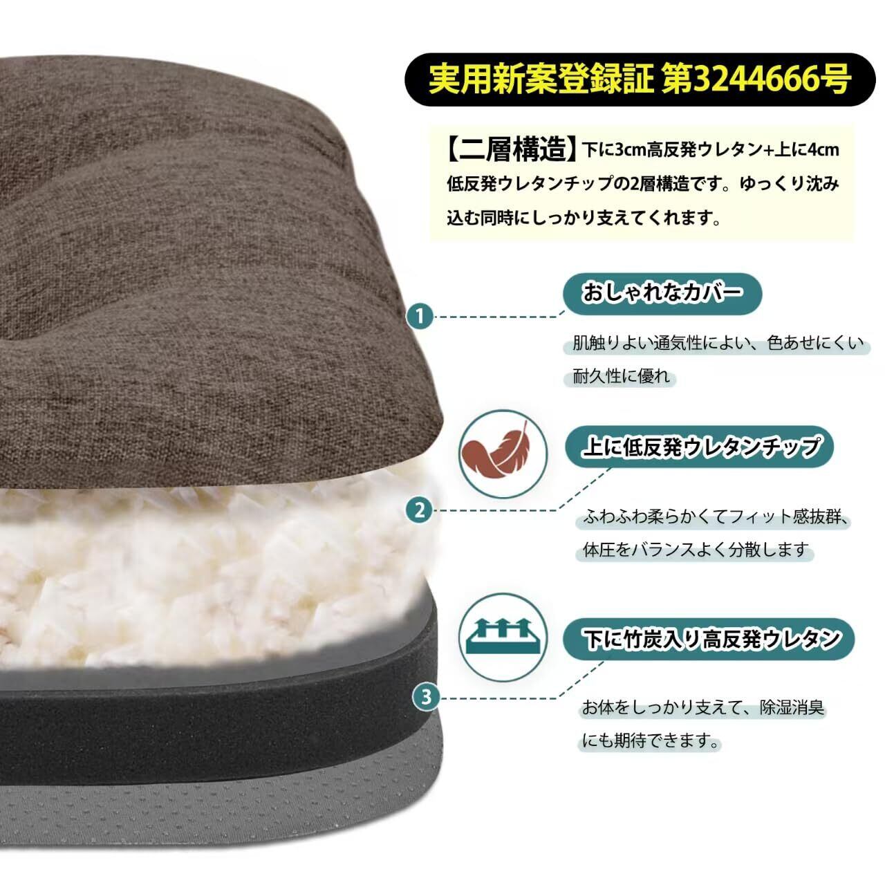 【二層構造】下に3cm高反発ウレタン+上に4cm低反発ウレタンチップの2層構造です(実用新案登録証-第3244666号)。ゆっくり沈み込む同時にしっかり支えてくれます。体圧をバランスよく分散して柔らかな座り心地と安定性の実現した上に、お体の負担を大幅に軽減します