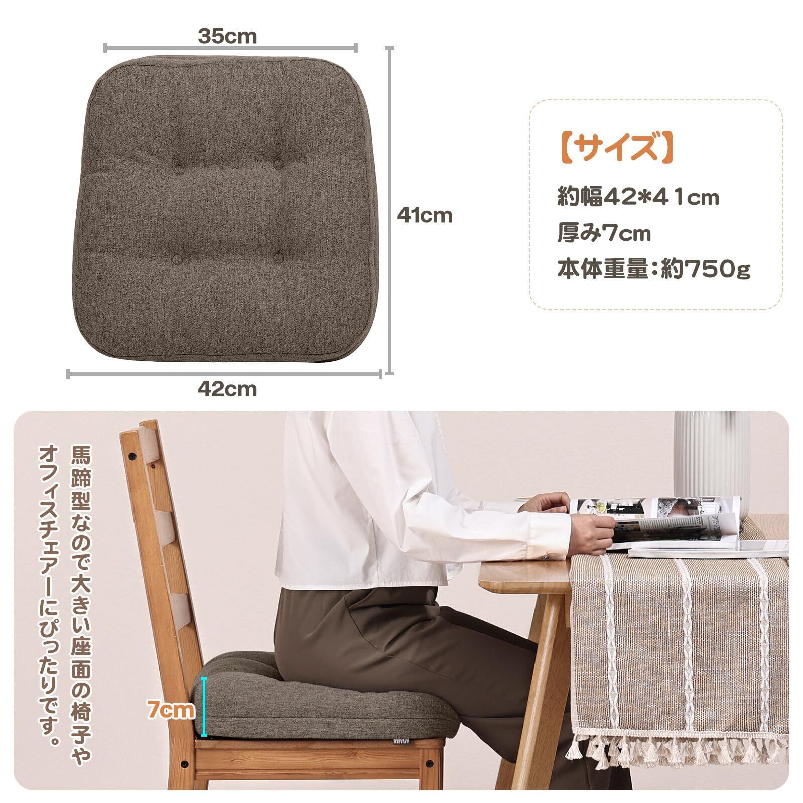 【サイズ】約幅42x41cm厚み7cm、本体重量:約750g。耐久性に優れたウレタン、通気性も手触りもよいカバー、適当な硬さ座り心地よい座布団.椅子クッションです