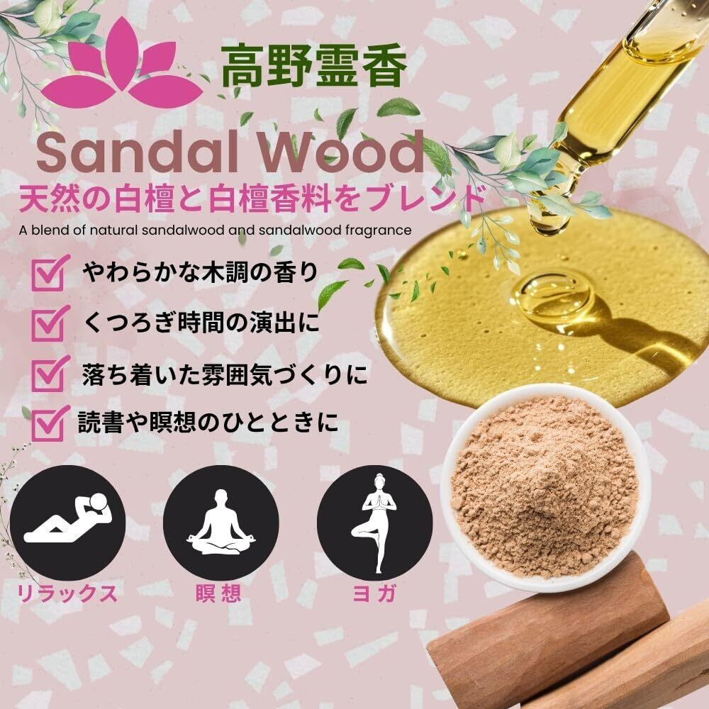 白檀の香りには、心を穏やかに整え、日々のストレスや疲れをやさしく癒す力があります。ふんわりとお部屋全体に広がるその香りが、リラックスしたいひとときをより豊かに、心地よく彩ってくれるでしょう。