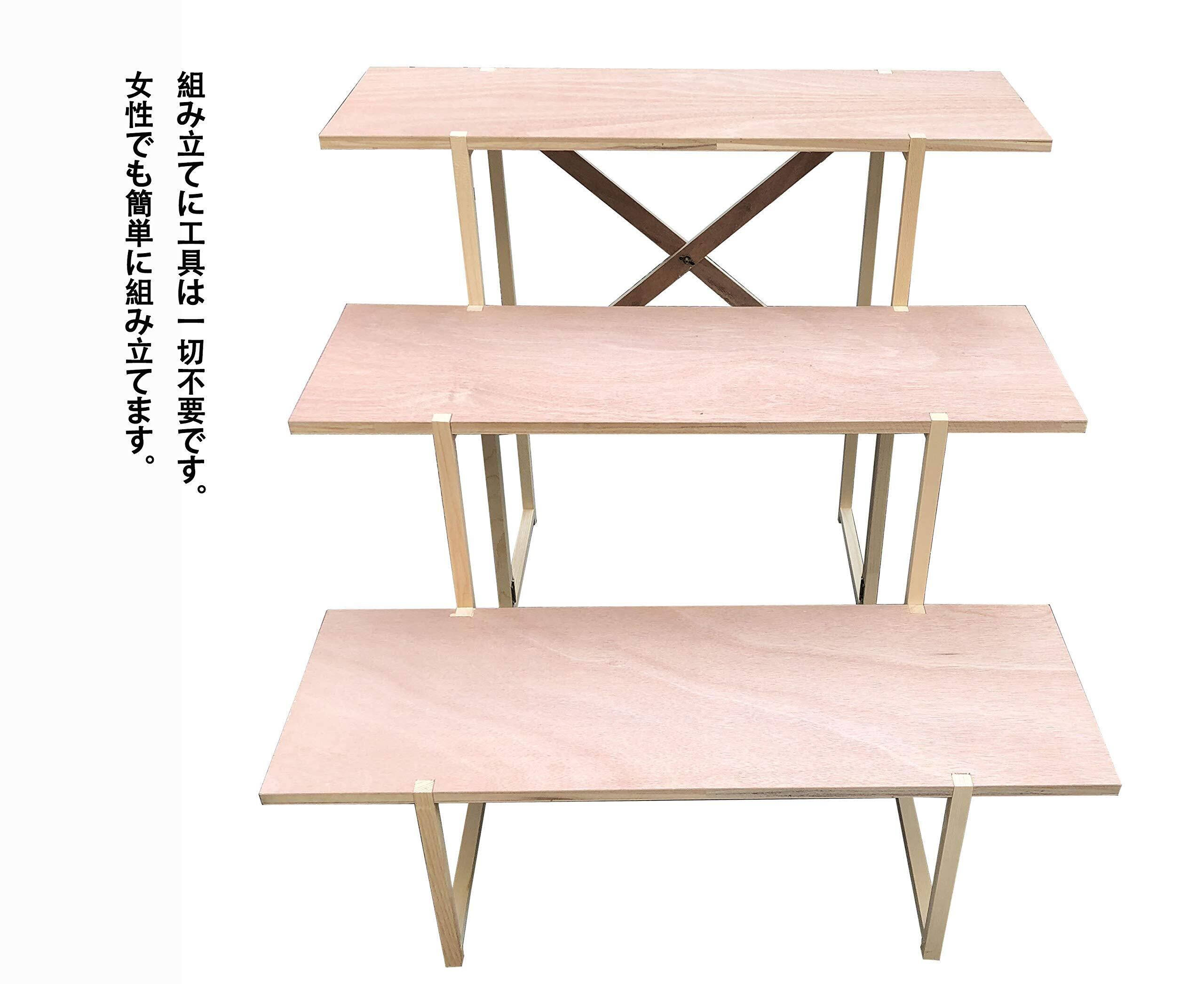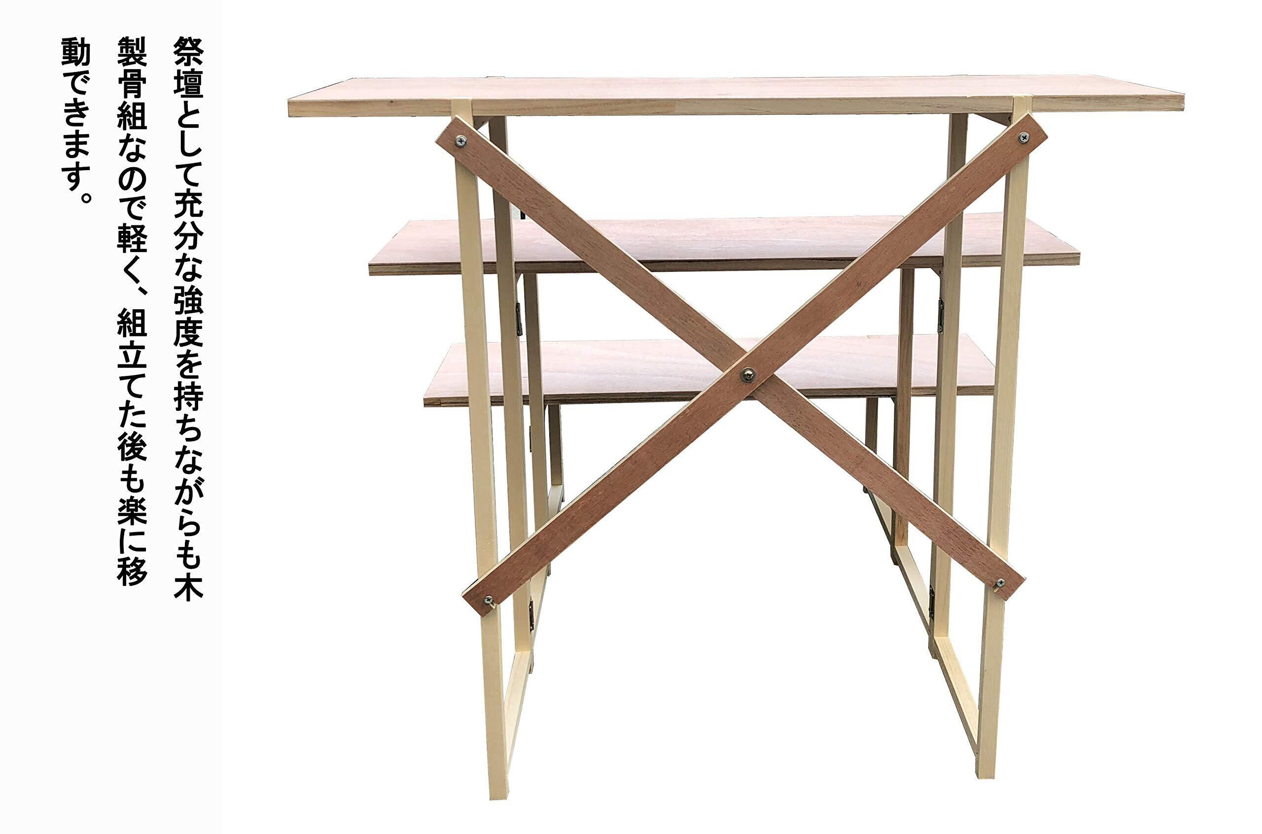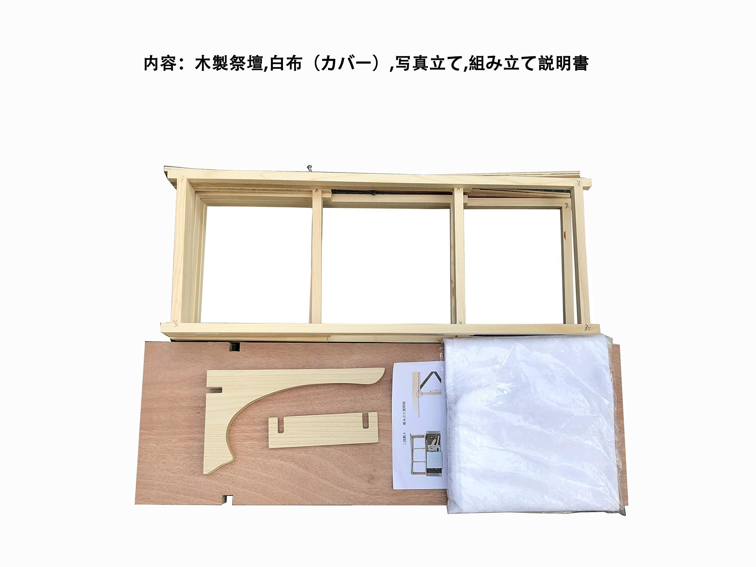 規格:総幅80×総高さ70×総奥行80cm(下段高さ26cm,下段棚板奥行27cm x中段高さ24cm, 中段棚板奥行27cm x 上段高さ20cm, 上段棚板奥行27cm)重さ:5kg 材質:木製。備考:組み立て式(説明書付)、白布付き、写真立て付き(高さ29cm)