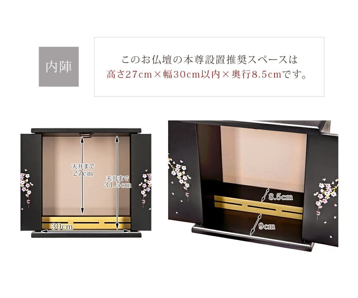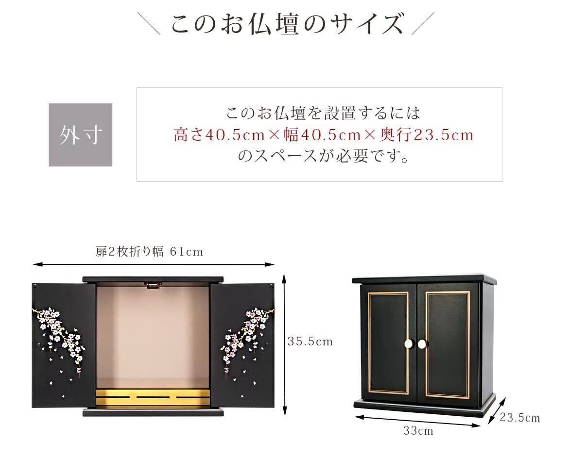 コンパクトで扱いやすいお手頃なミニ仏壇です。シンプルで場所を選ばないデザインとなっており、 扉を開くと両サイドにはさくらの花が鮮やかに描かれています。