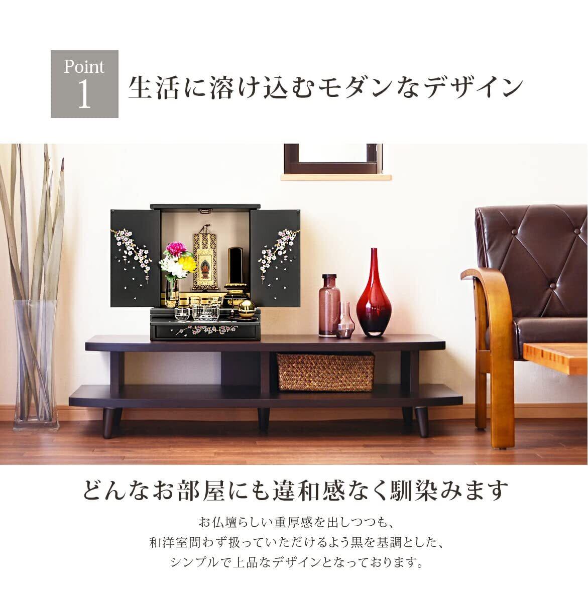 サイズ感も現代の住宅環境ともマッチしており、 扱いやすいお仏壇となっております。鮮やかに描かれたさくらの花と金の須弥壇は御本尊様をより一層荘厳します。 非常にお求めやすい価格帯でも末永く大事に使えるお仏壇です。 クオリティを下げることなく提供できるようにと限界までこだわりました。